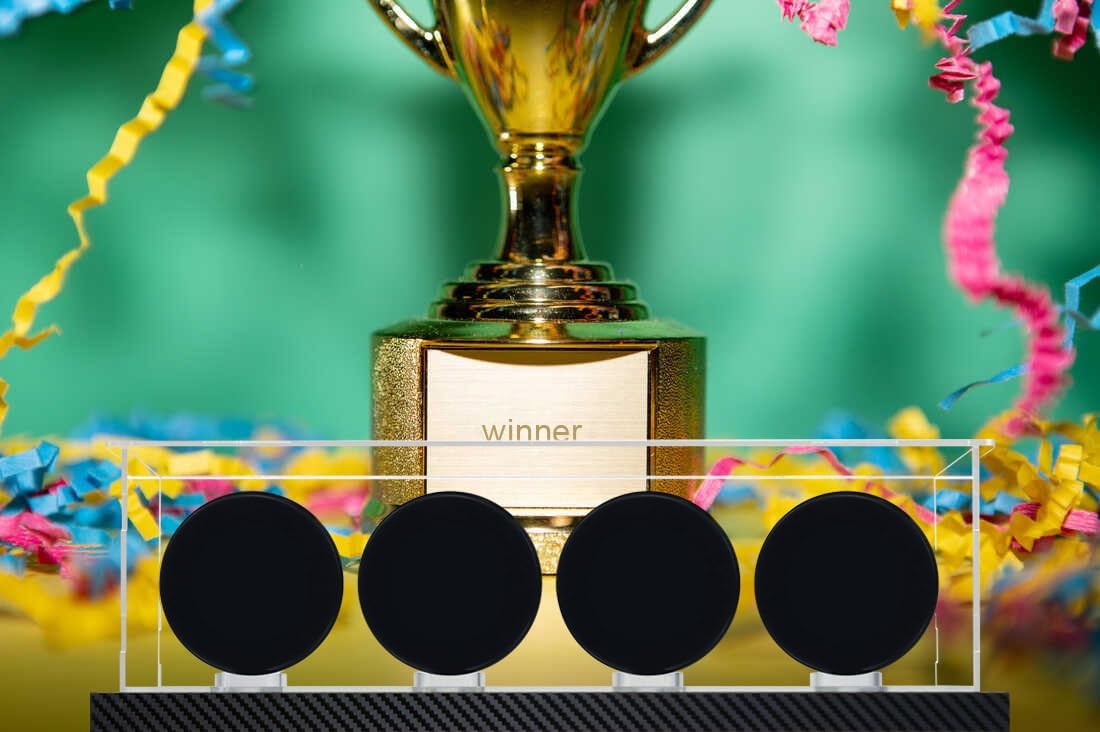 Hockey Puck Display Case for 4 Pack in one, Arcylic Puck Display Holder Stand UV Protected Dustproof Clear Display Cube Free Standing Display Cases with Carbon Fiber Skin Base and Mirror Base