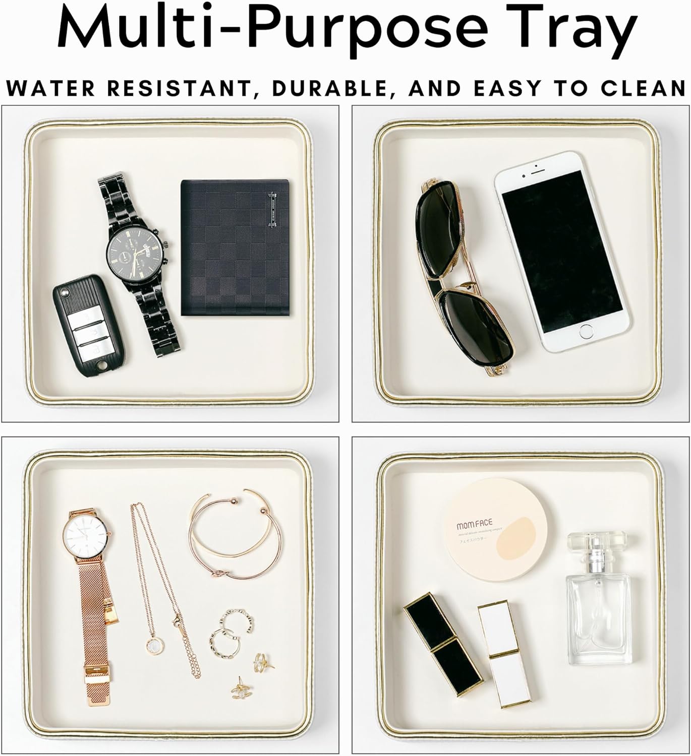 - 🎁 Durability Meets High Design: Crafted from an easy-to-clean small desk tray, our bedside organizer is more than just a pretty face. Hand-stitched for durability, with a water-resistant finish and raised edges to secure your items, it blends practicality and luxury in every detail. Whether you’re searching for a jewelry tray for women, a watch tray for men, or stylish dresser decor for bedroom aesthetic, this versatile small vanity tray is the perfect choice to elevate your space.