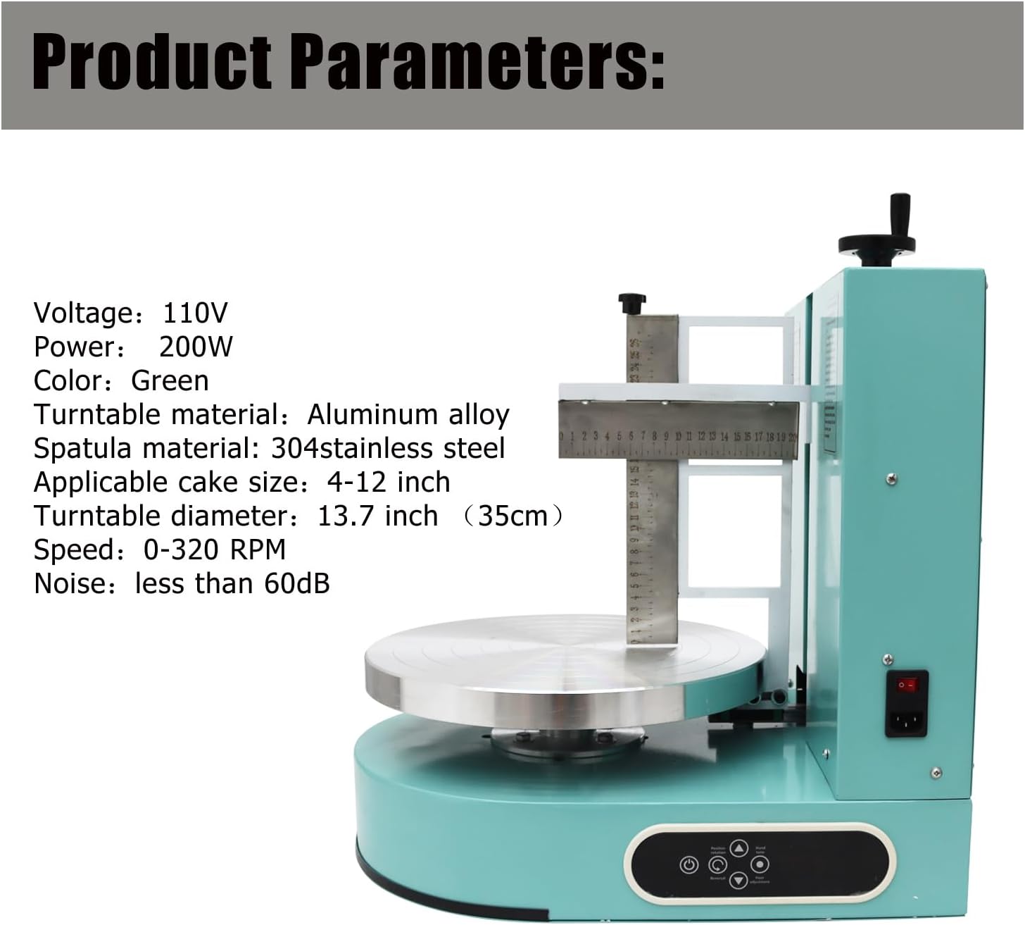 - 【Product Parameters】:Voltage:110V;Power:200W;Color:Green;Turntable material:Aluminum alloy;Spatula material: 304stainless steel;Applicable cake size:4-12 inch;Turntable diameter:13.7 inch (35cm);Speed:0-320 RPM;Noise:less than 60dB;Machine size:18.5*14.5*18.9 inch (47*37*48cm)