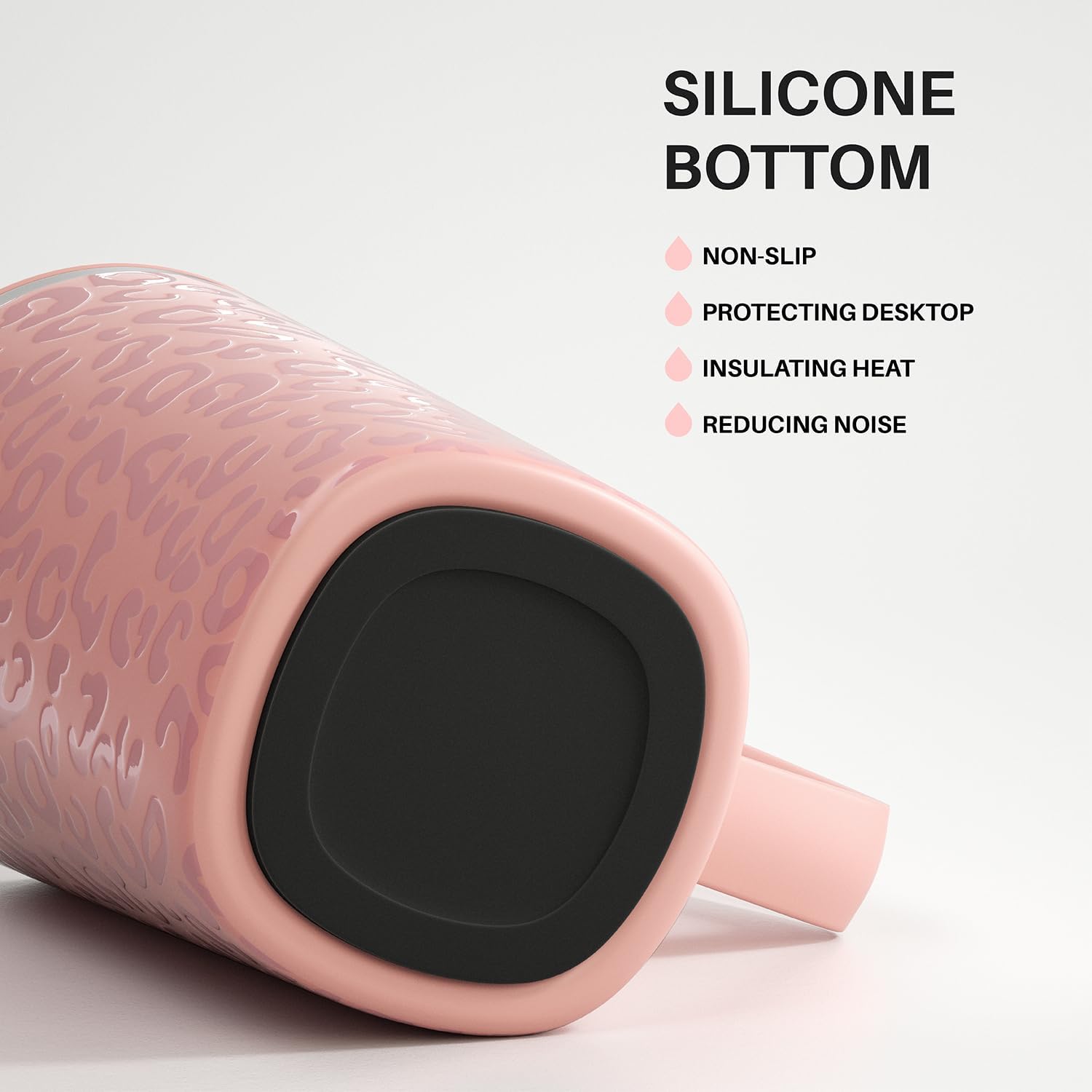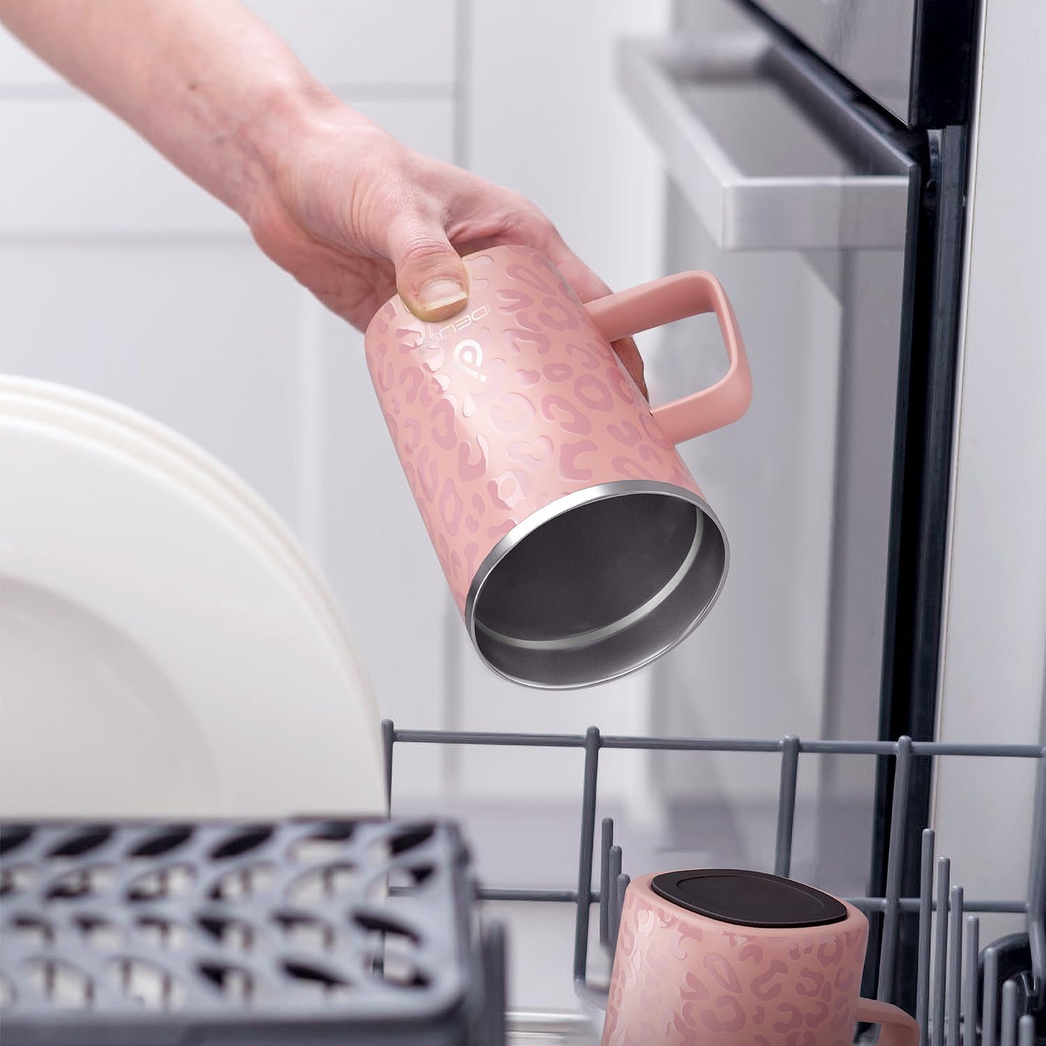 Ideus Vacuum Insulated Coffee Mug, 16oz Reusable Stainless Steel Thermal Double Walled cup with Handle and Slider Lid for Hot & Cold Beverages, BPA Free (Leapord Pink)
