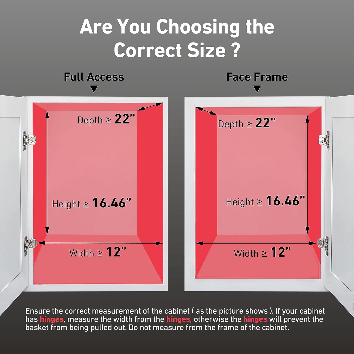 - 【Choose Suitable Size】 Our cabinet pull out shelf dimensions measure 11" Wide x 21" Depth x 15.46" Height. Requires at least 12 inch inner wide openings(inner wide must be measure from the hinges), 22 inch inner depth and 16.46 inch inner height.