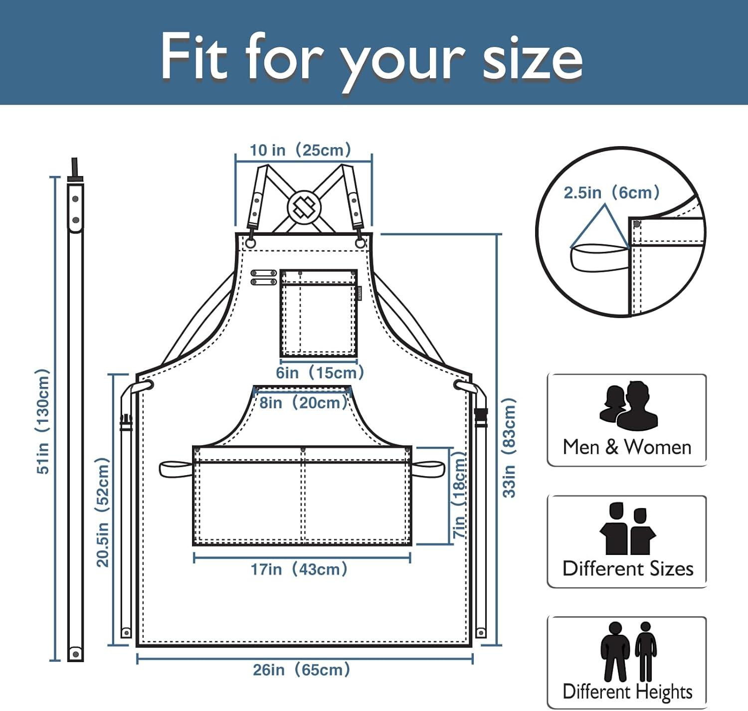 - Fashionable and Professional Protection: This canvas apron is designed to be stylish and provide professional protection, providing good coverage and protection from the chest to the knees, preventing grease , sawdust and dirt from dirtying clothes