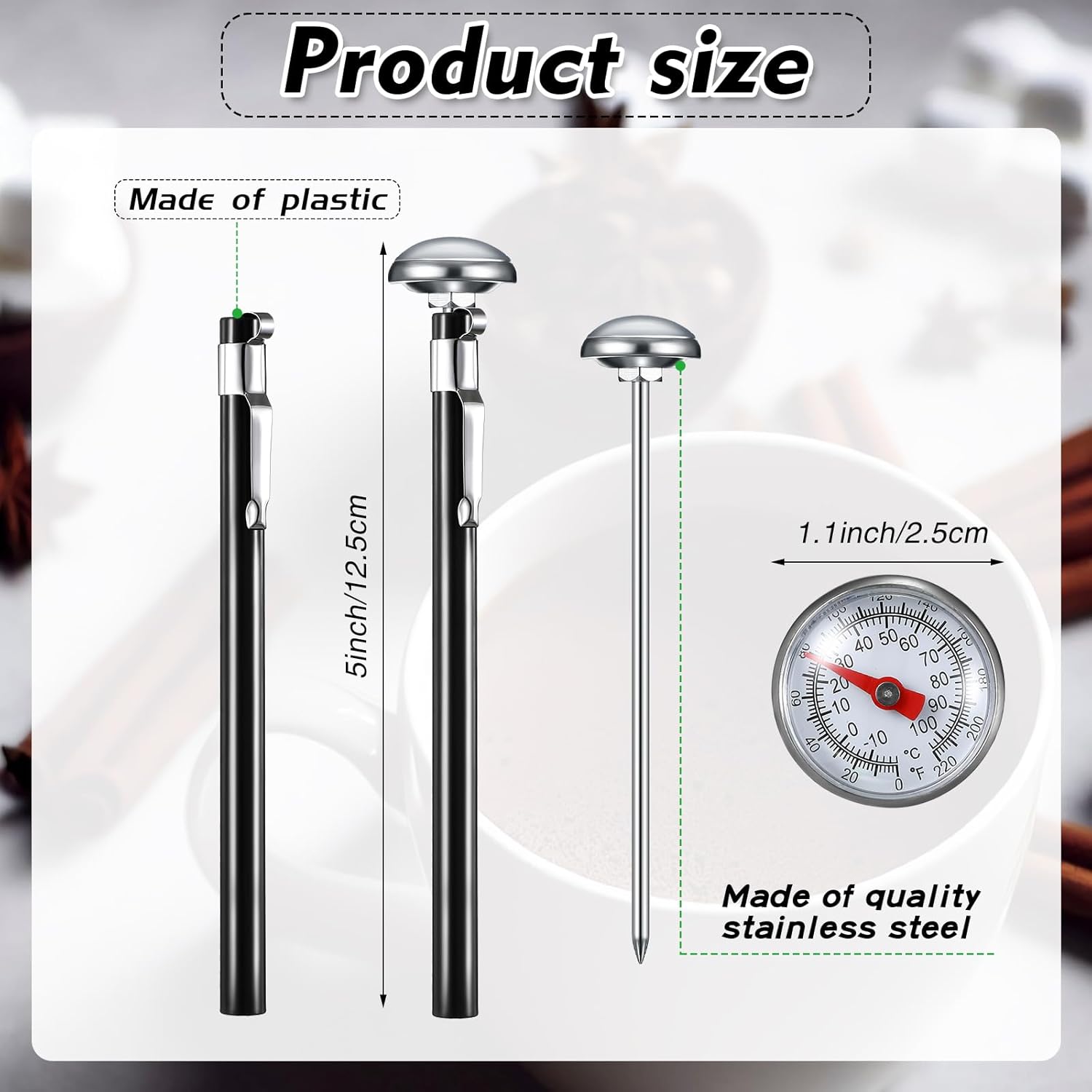 - Size Information: our dial is about 1 inches/ 2.5 cm in diameter, and this long stem is about 5 inches/ 12.5 cm in length, compact and proper, you can use this water thermometer to measure a lot of liquid, handy and comfortable, to bring you a cozy feeling