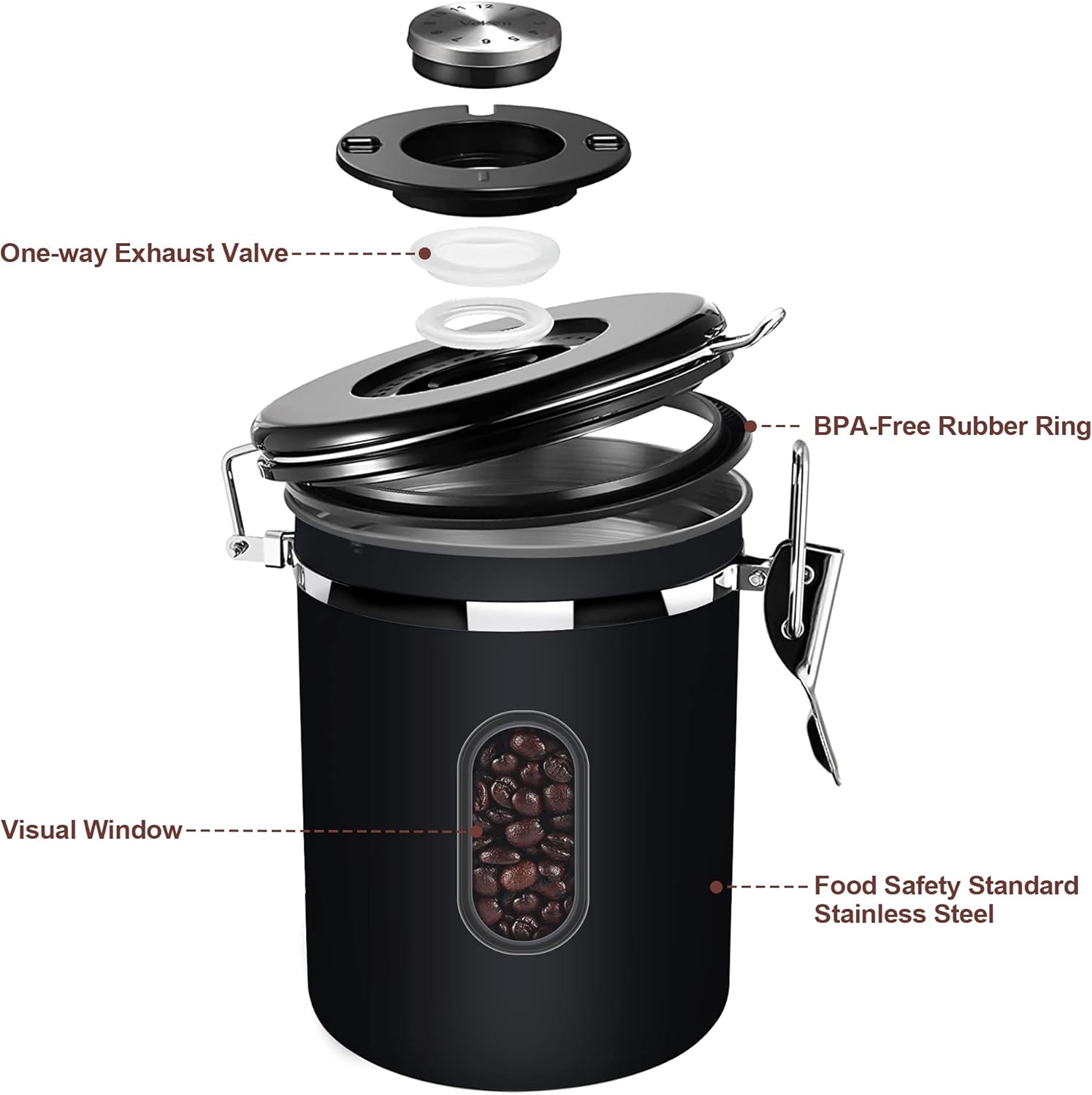 1800ML Airtight Coffee Canister with Date Tracker&Transparent Window, 22.8OZ Coffee Container with 30ML Measure Spoon&4 co2 Valve, Coffee Bean Storage Container for Grounds Coffee, Beans, Tea(Black)