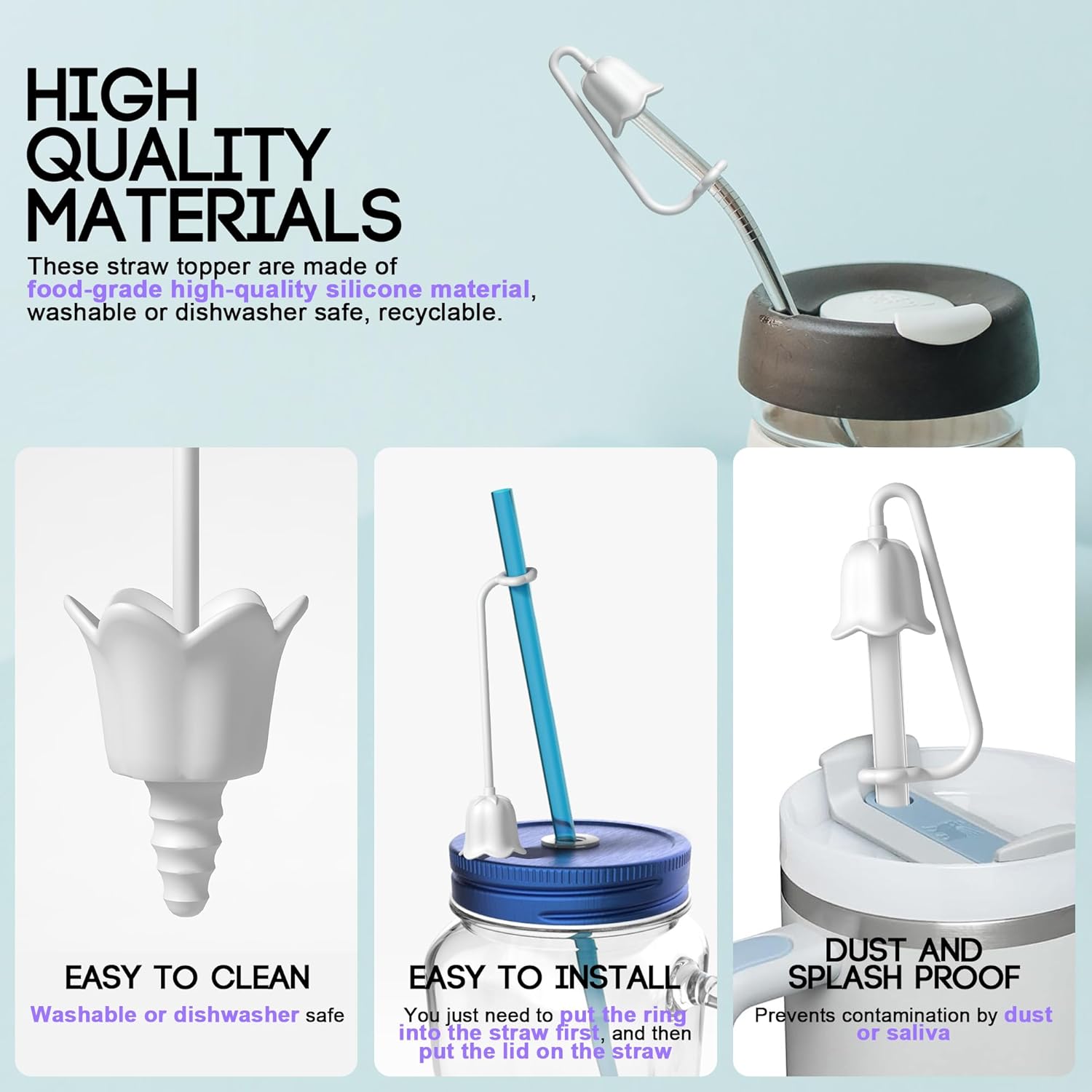 - [High Quality Material& Easy of Cleaning] Our straw covers are made of stretchy food-grade silicone which is no stitching make it less likely to break and more beautiful, which fits the straw better and easier to put on and off the straw lid, the straw cap can be turnover for easy cleaning