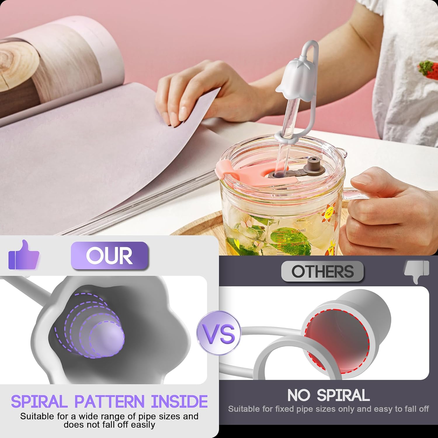 - [Easy to use] Note: In order to effectively prevent leakage, please turn over the petals of the straw cap over before use to ensure that the straw cap and the straw fit perfectly (please refer to the video for the specific steps)