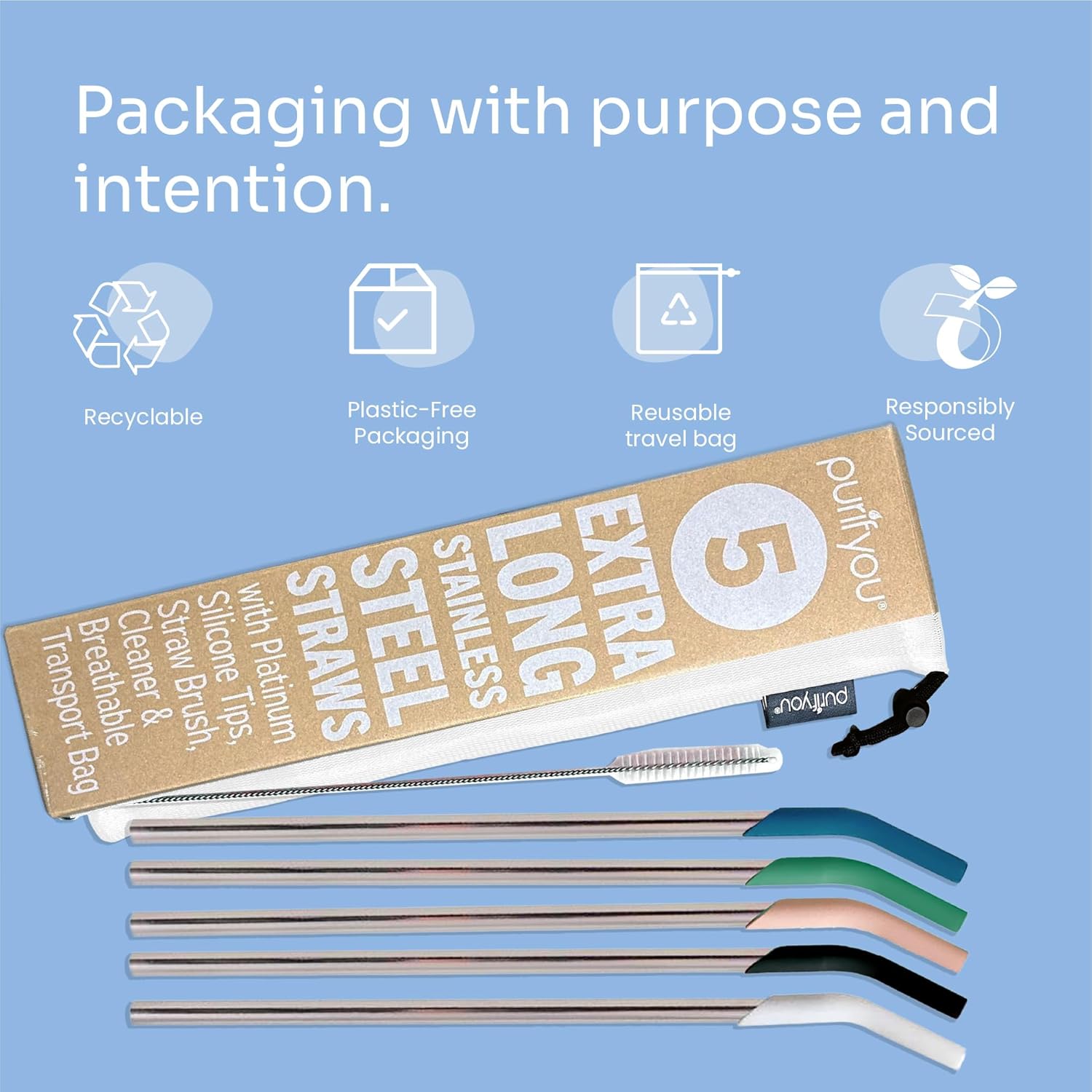 - Reusable straws metal set includes 5 stainless steel straws, 5 silicone tips, cleaning brush, and travel bag. BPA-free, dishwasher safe, and eco-friendly.