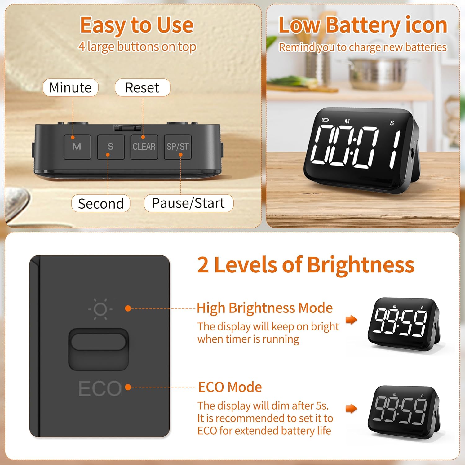 - Easy to Use Digital Timer - Are you still looking for a timer which is much easy to use, comes with large bright numbers and loud alarm? This timer could meet your needs. 1.3in tall bright numbers and intuitive buttons make it very easy to set and read. Powered by three AAA batteries (INCLUDED), a low power icon to remind you to change new batteries when they are around consumed. NOTE: IT IS STRONGLY SUGGESTED TO SET THE TIMER TO ECO FOR EXTENDED BATTERY LIFE