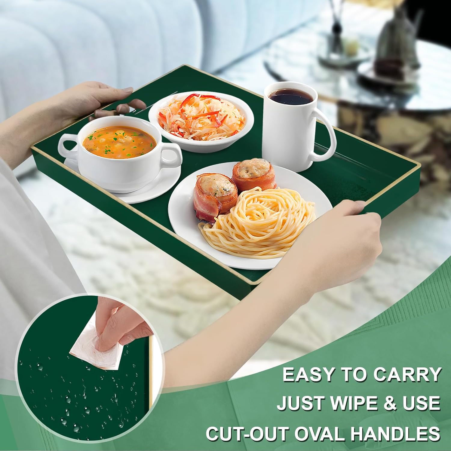 - TRAY DECOR: Dark green tray is often used to present food and drinks in an appealing and organized manner. Rectangle tray can enhance the visual appeal of the items being served, making them more enticing to guests or customers. Also place it on your bathroom vanity as an exquisite showcase for perfumes, jewelry, or bath accessories.