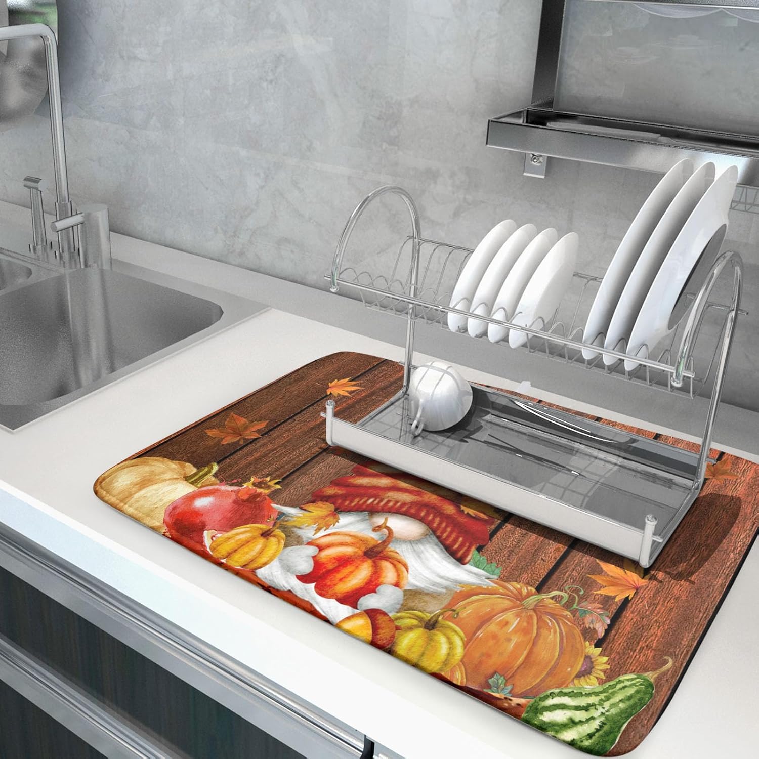Fall Gnome Dish Drying Mat for Kitchen Counter,Autumn Pumpkin Maple Leaves Drying Mat 18 x 24 Inch Microfiber Dark Brown Wood Dish Drying Pad Dish Rack Drainer Mat Thanksgiving Day Decor