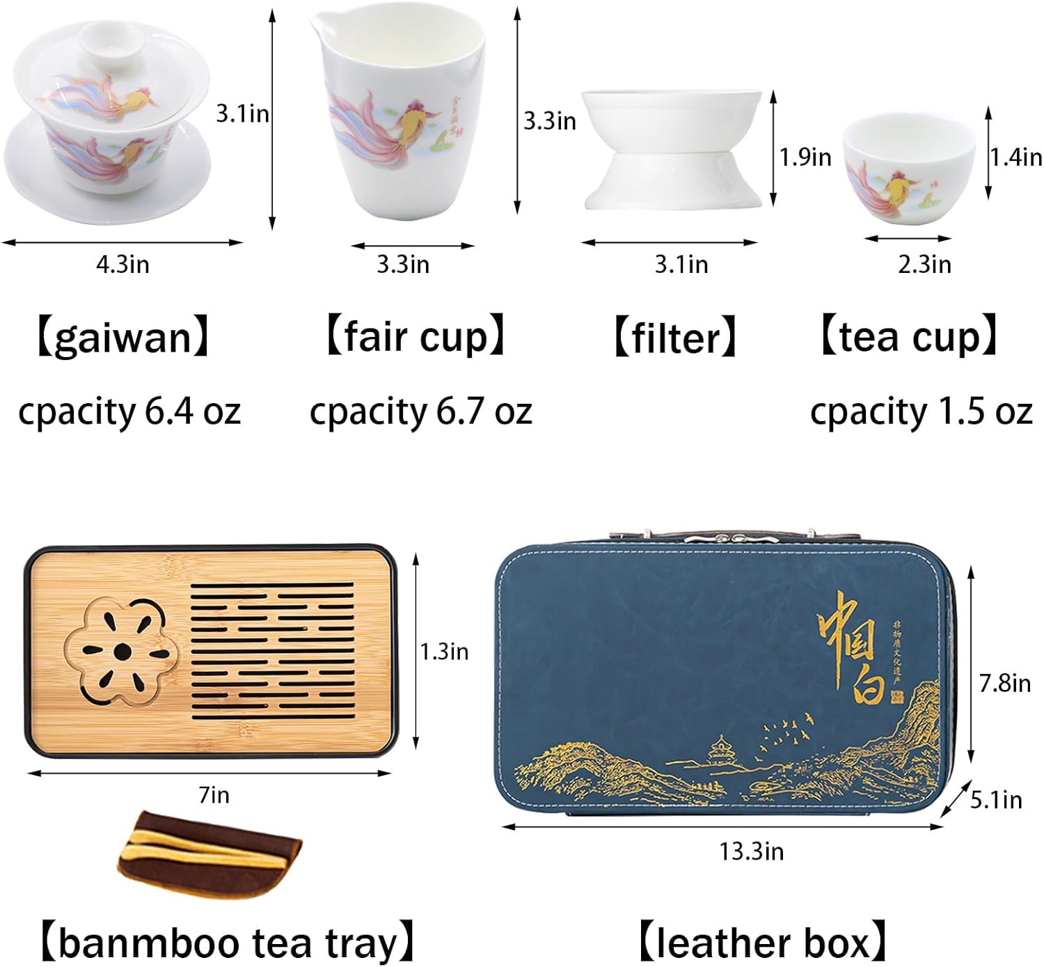 - 【14-Piece Chinese Tea Set 】This ceramic tea set combines traditional chinese tea cups with a chinese gaiwan and color-changing Pixiu tea pet. It includes 6 cups (1.5oz/45ml), gaiwan (6.4oz/190ml), fair/Infuser pot (6.7oz/200ml), pixiu tea pet, tea strainer, tea clip, tea towel, tea tray and travel bag