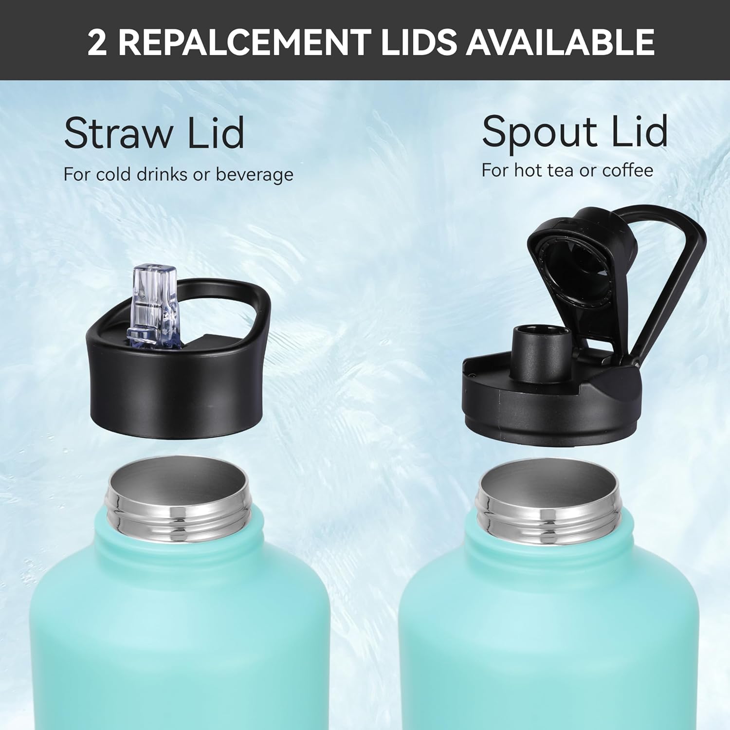 - 【SPOUT LID & STRAW LID】This 64 oz stainless steel water bottle comes with spout lid and straw lid, two different lids are complete LEAK PROOF & design for easy drink. Use the one with the mouthpiece for hot drinks, and the one with the straw for cold beverages. Wide mouth design allows for hassle-free bottle cleaning and ice adding.