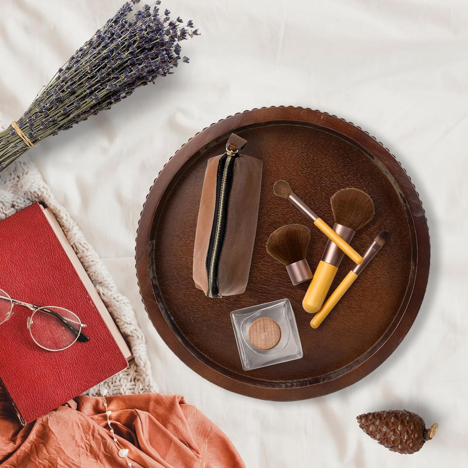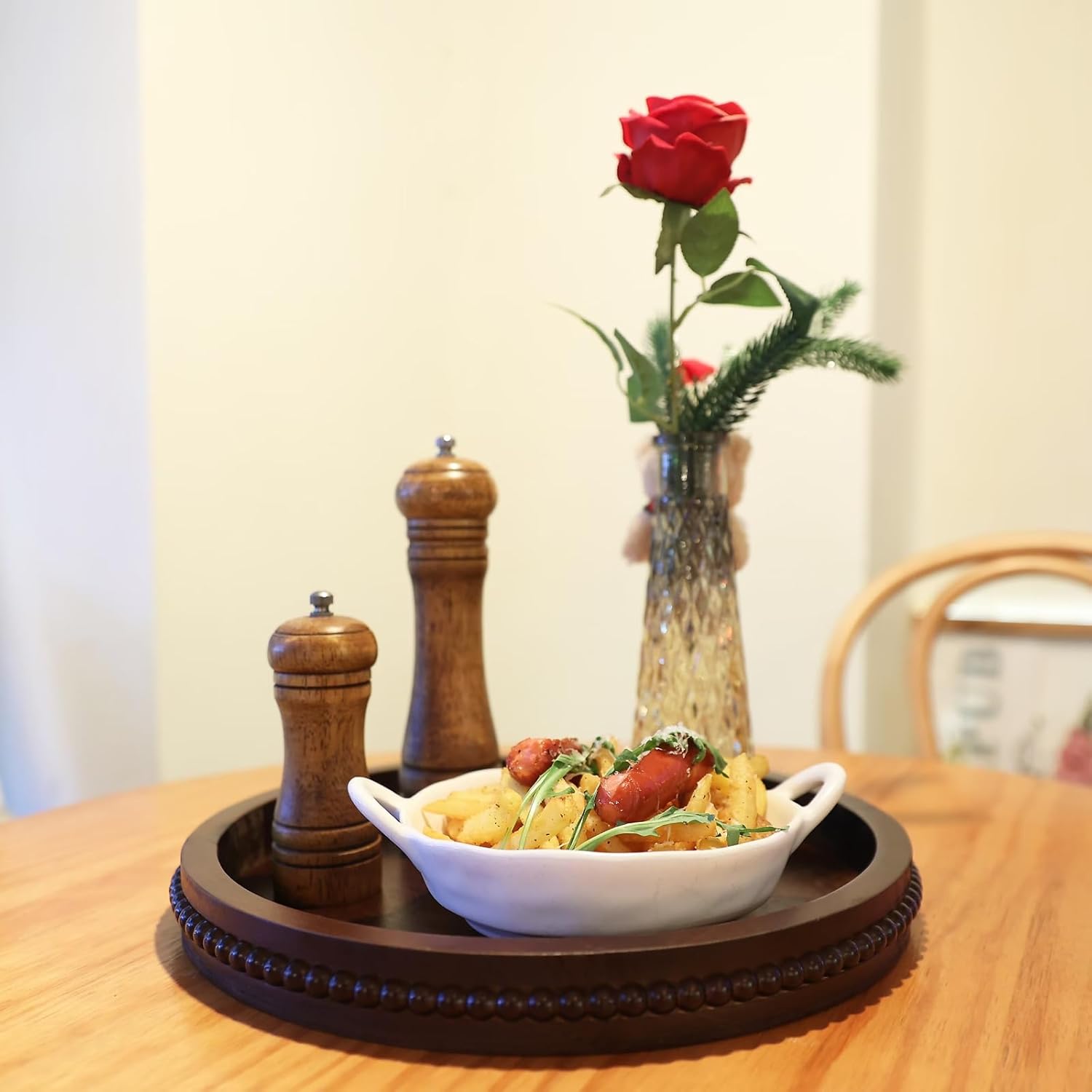 Wood Decorative Serving Tray with Bead, Round Vintage Wooden Ottoman Tray for Home Centerpiece, Counter Organizer, 13” Circle Tray for Kitchen, Living Room (Dark Brown)