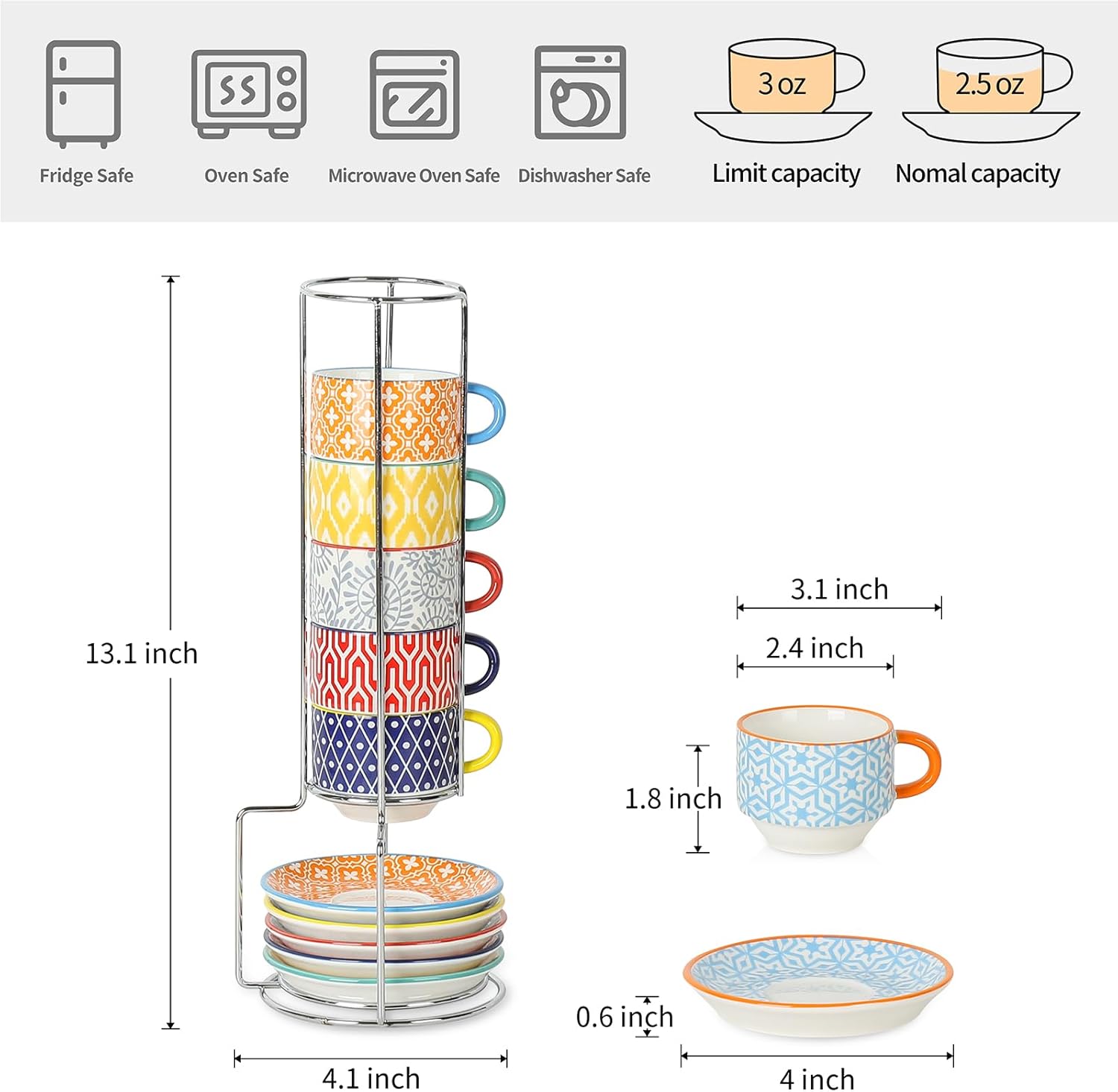 Selamica Ceramic Espresso Cups with Saucers, 2.5 OZ Stackable Demitasse Cups with Metal Stand, Mini Espresso Mugs for Latte Coffee Café Mocha Tea, Set of 6, Assorted Colors
