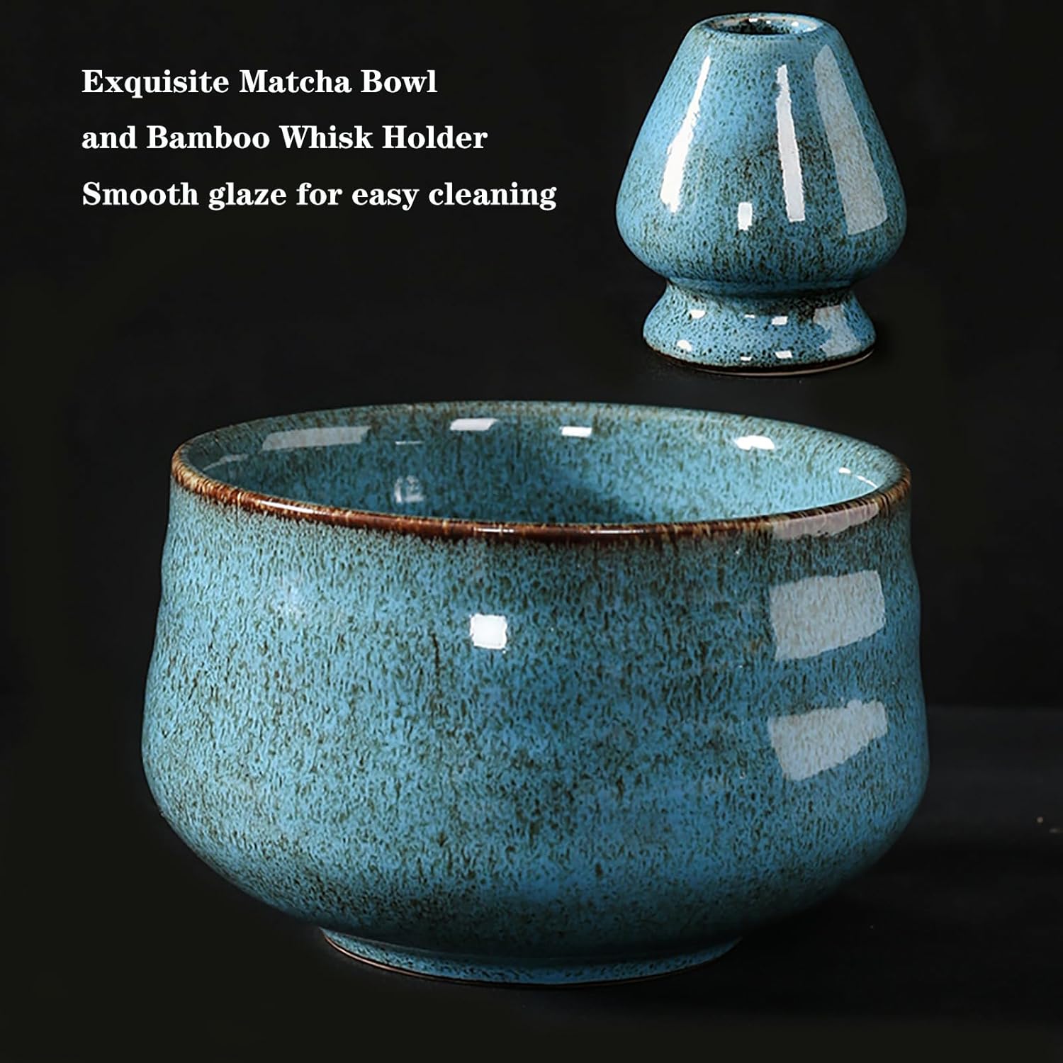 Japanese Matcha Tea Set(7pcs),Matcha Bowl And Whisk Set,Whisk Holder, Matcha Powder Sifter, Bamboo Scoop,The Perfect Matcha Tools Kit For Matcha Tea Ceremony (Kiln Glaze-Blue)