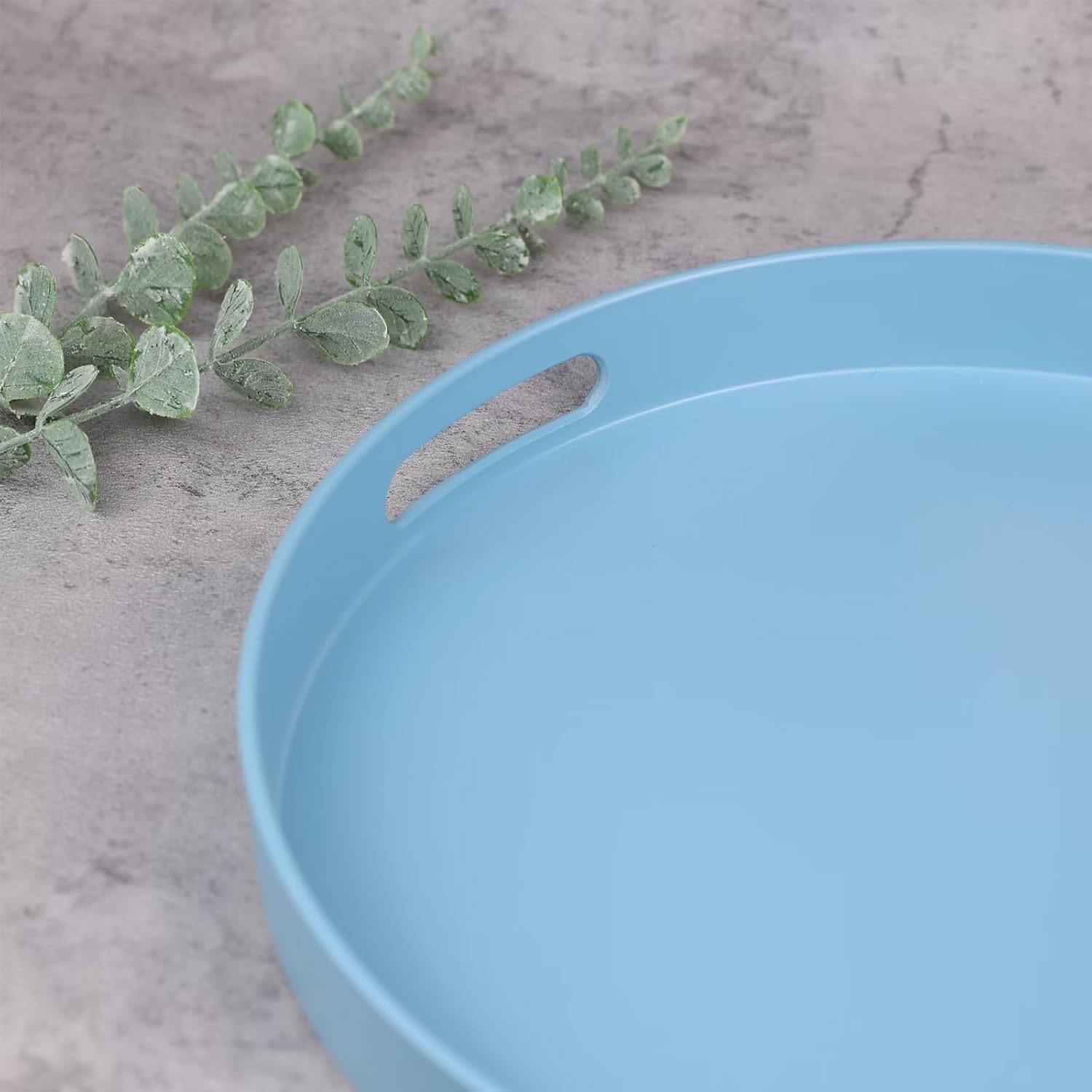 Round Blue Decorative Serving Tray with Handles, 13” Versatile Ottoman Tray for Coffee Table, Entertaining, Outdoor Patio, Living Room