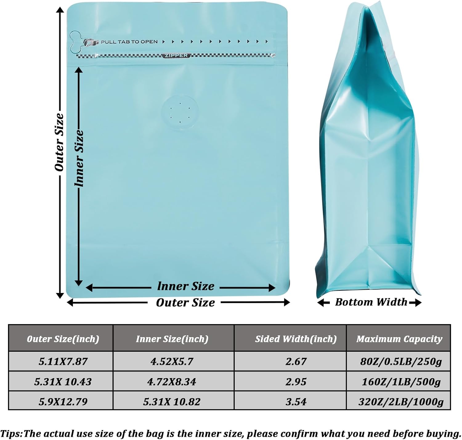 - 【Size & Quantity】50 PCS food packaging coffee bags empty, 5.31×10.43 inch, volume of 16oz/1lb/500g, double-sided thickness of 28 wires, aluminum foil flat bottom resealable side zipper smell proof bags with one-way air valve.