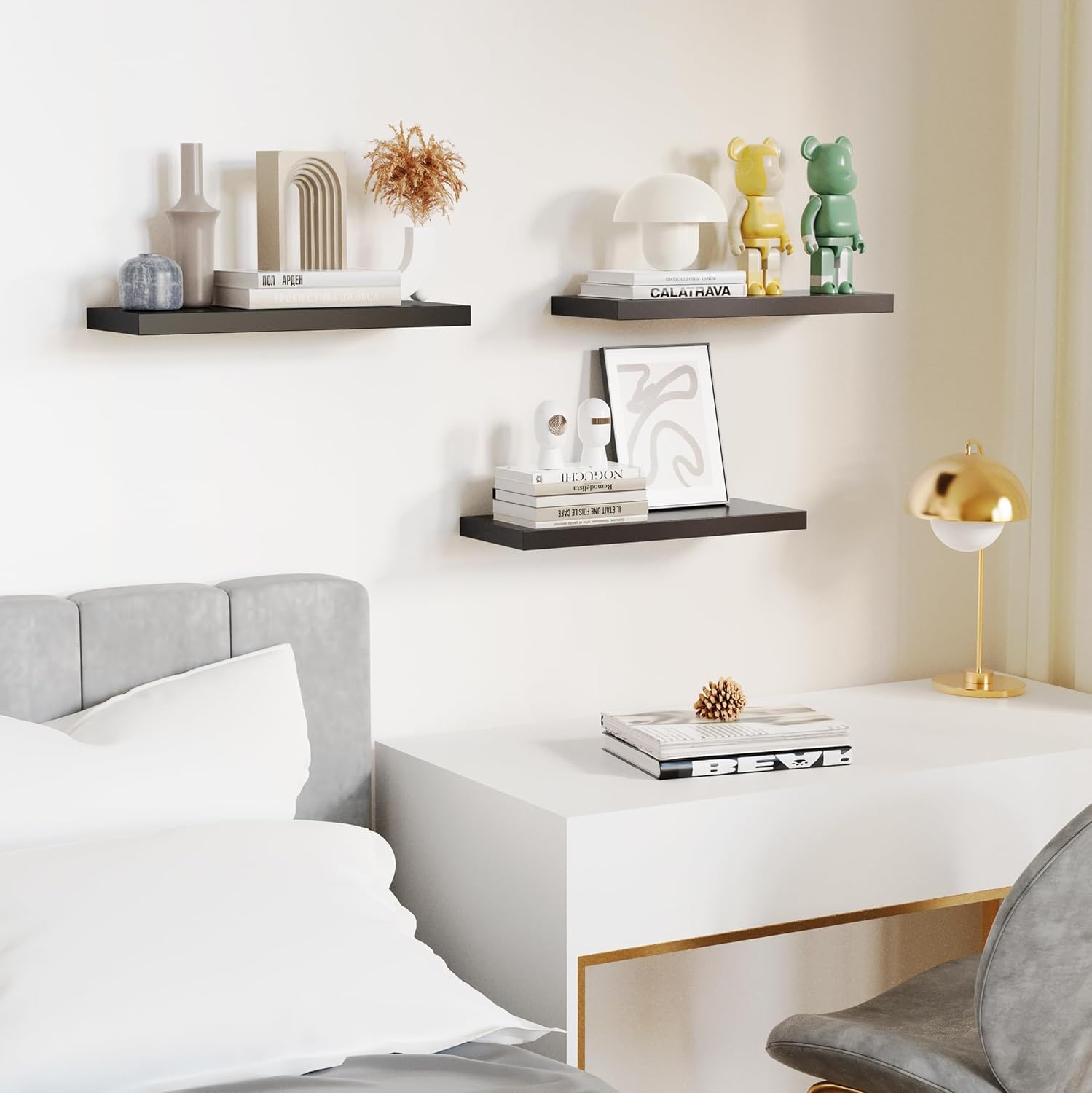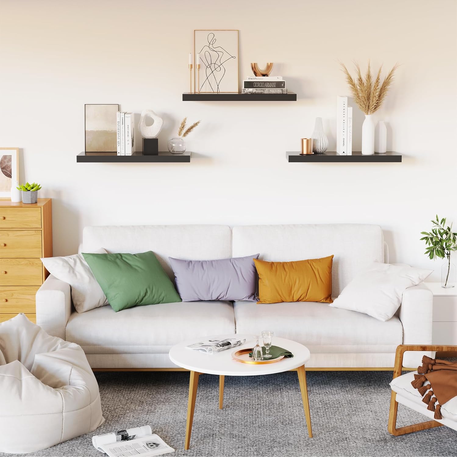 - 【Modern Concise Design】Our black floating shelves are designed with modern simplicity. It has streamlined look to bring modern style and vintage atmosphere to the home. Our wood floating shelves for wall is a set of 3 wall mounted shelves. Our rustic wood shelves can give us plenty of space for creativity, we can choose a line, a ladder shape, or a symmetric way. Let our floating shelf wood more suitable to the home decor and bring a better visual experience.