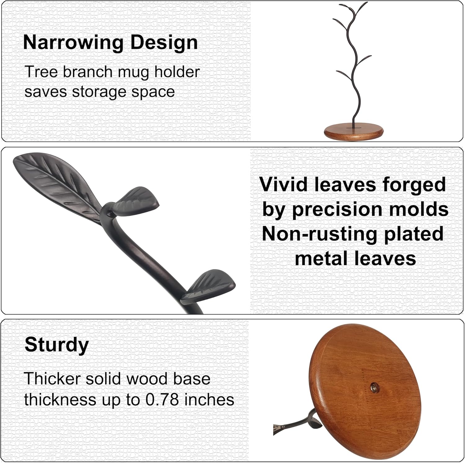 - 【STYLISH & ELEGANT】- This coffee mug holder stand inspires an up-to-date look that is fresh and contemporary.Simple leaf shape paired with classic wood base creates a traditional appearance with a modern flair,sleek and stylish design make it become an elegant artist ornament on your table and the ultimate coffee station organizer.