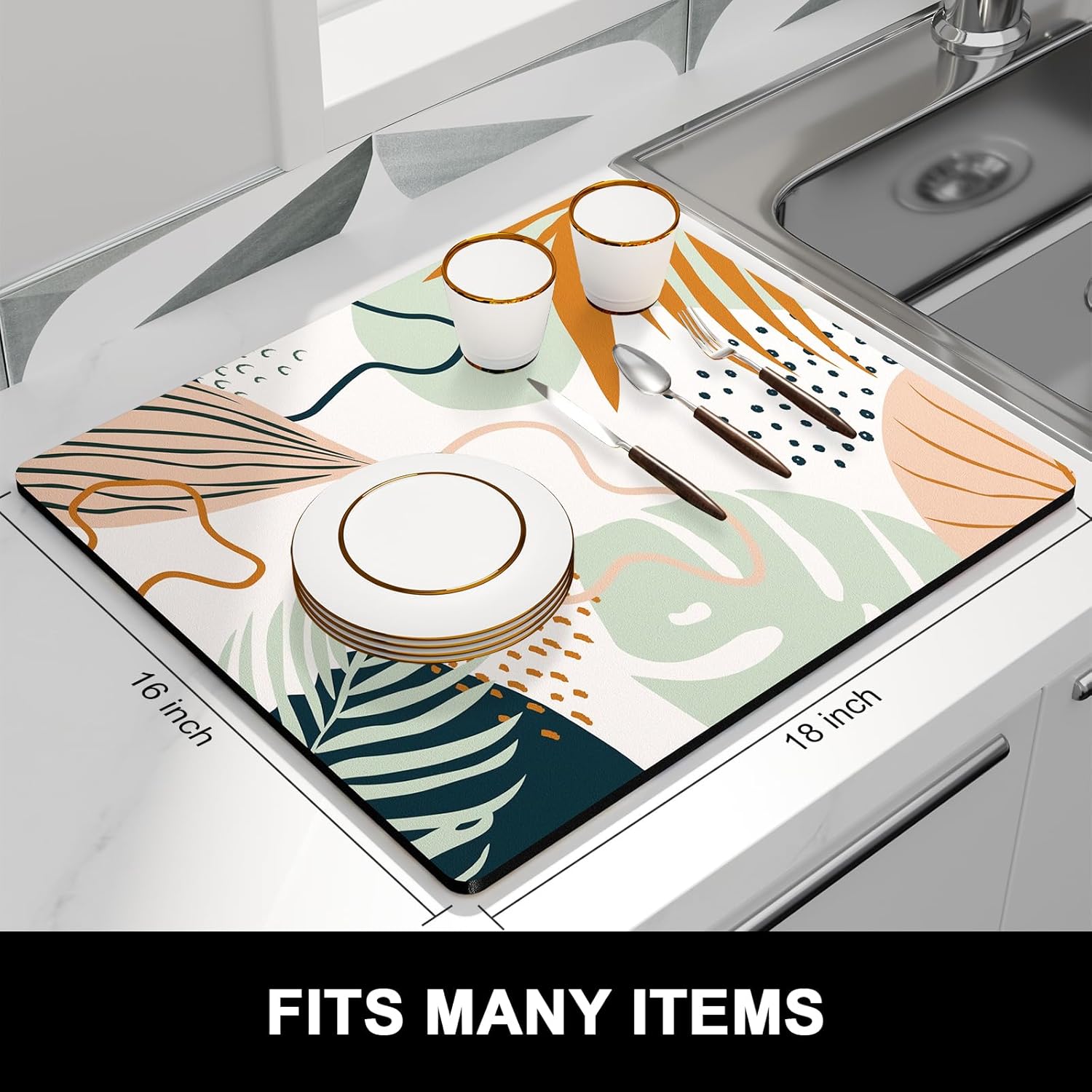 Rnivvi Dish Drying Mat for Kitchen Counter, 16 x 18" Cute Boho Theme Absorbent Heat Resistant Drying Pad with Non-slip Rubber, Coffee Bar Mats for Coffee Machine Dish Rack, Tropical Leaves