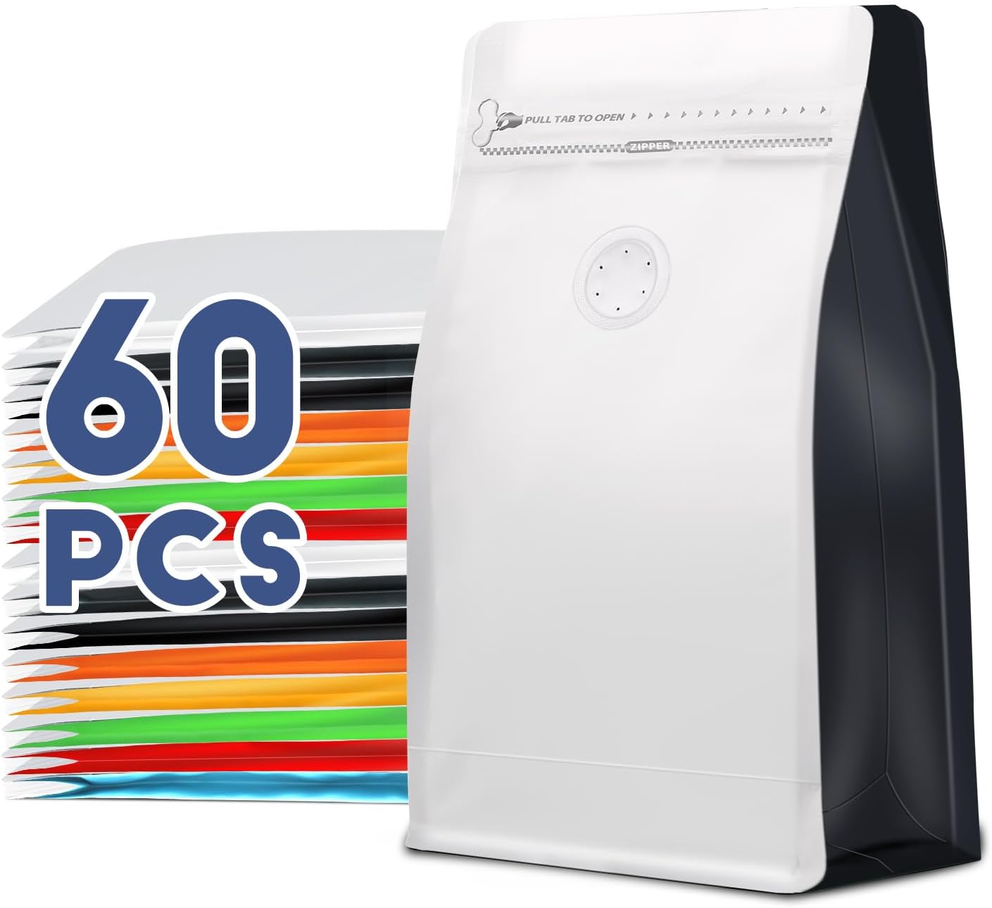 Coffee Bags with Valve(60pcs,8 oz,1/2 lb) Vented Coffee Beans Packaging Bags High Barrier Aluminumed Foil Flat Bottom Heat Sealed Side Zipper Resealable Storage Bag for Home or Business(White+Black)