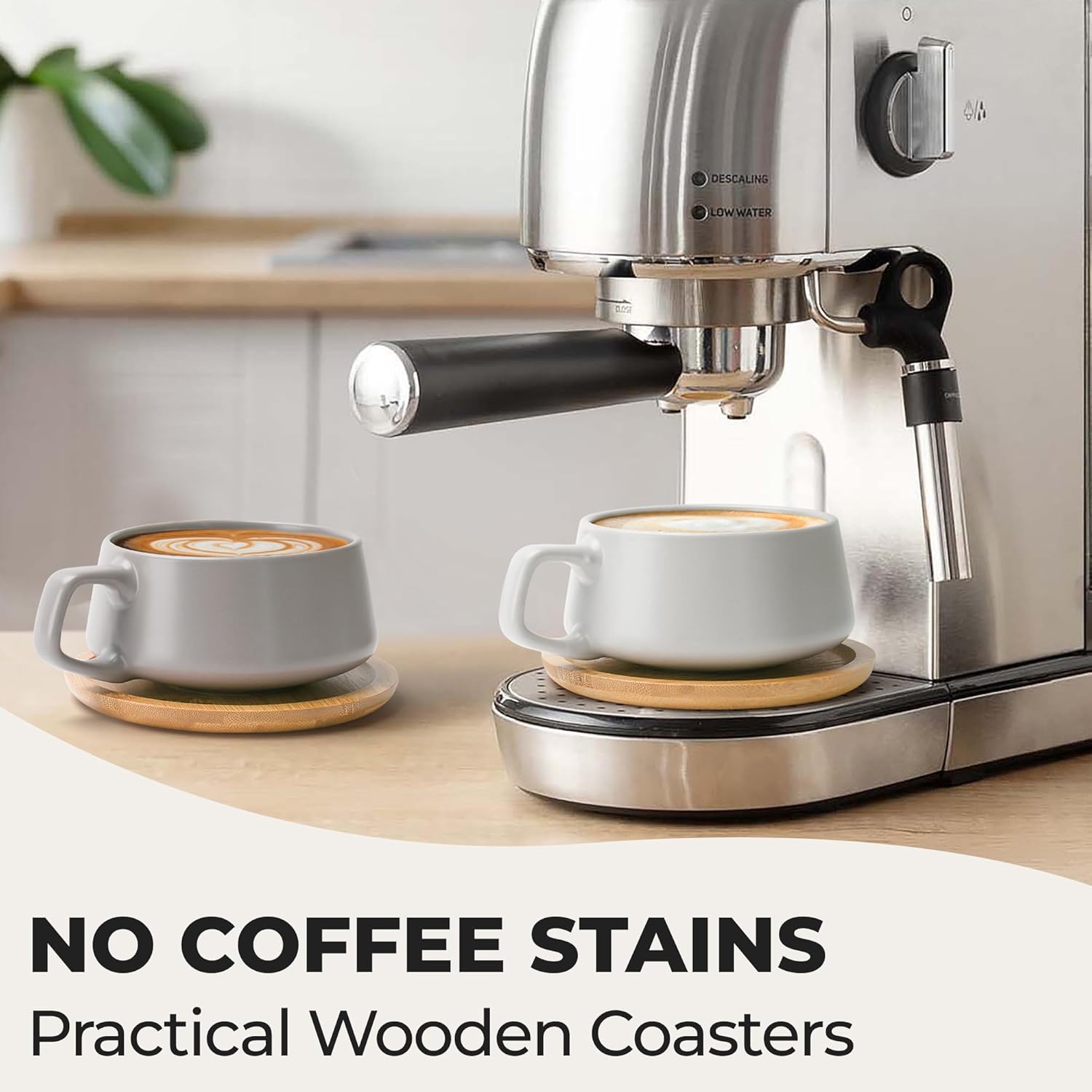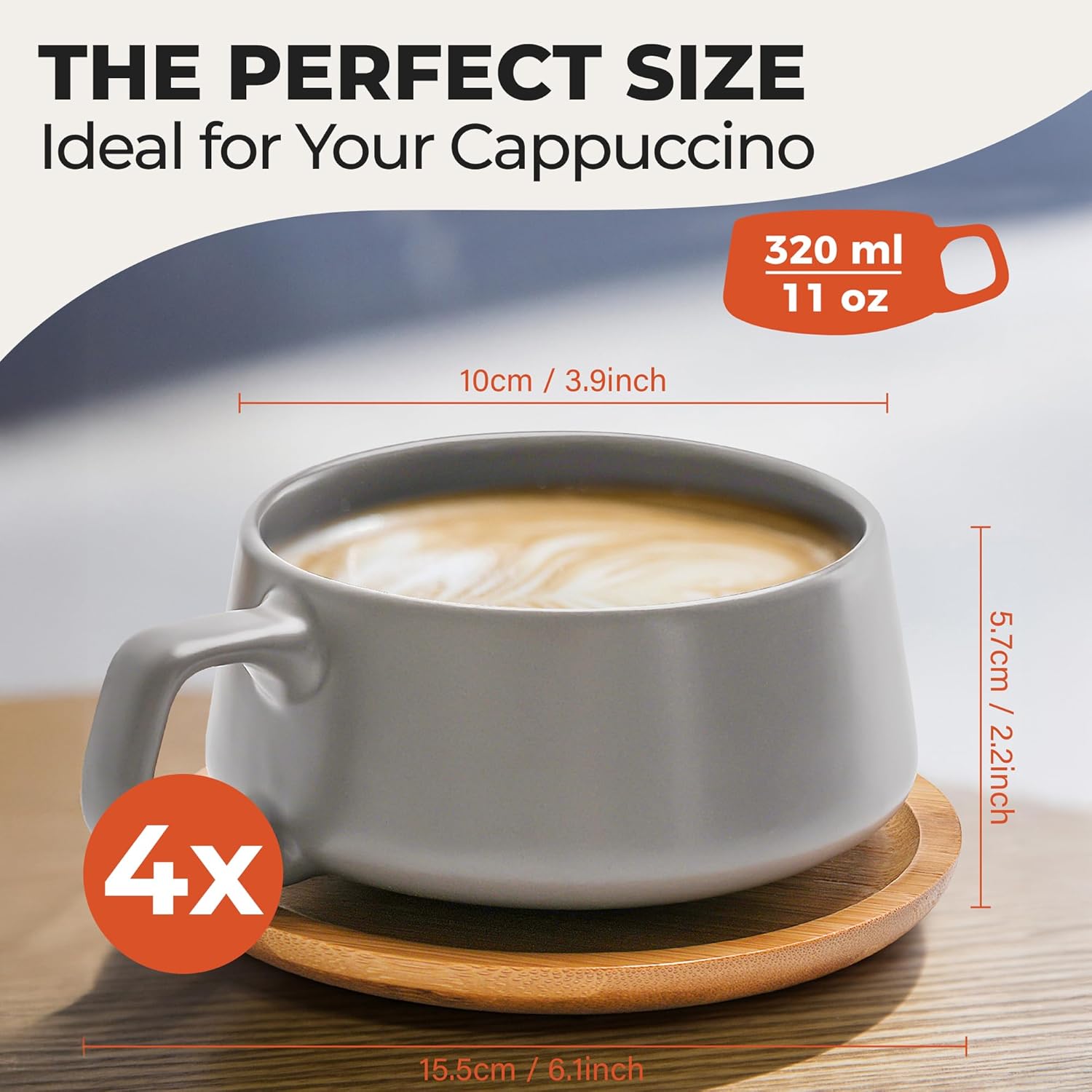 - 𝐓𝐇𝐄 𝐏𝐄𝐑𝐅𝐄𝐂𝐓 𝐒𝐈𝐙𝐄 - Coffee mug set consists of 4 great coffee pots with wooden saucer. With a capacity of 11 Ounces, a diameter of 3.9 Inches and a height of 2.2 Inches, the coffee cups are ideal for your favorite hot drinks. Whether it's coffee, latte macchiato, cappuccino, espresso or tea, these cups / glasses are big enough for all your favorite drinks.