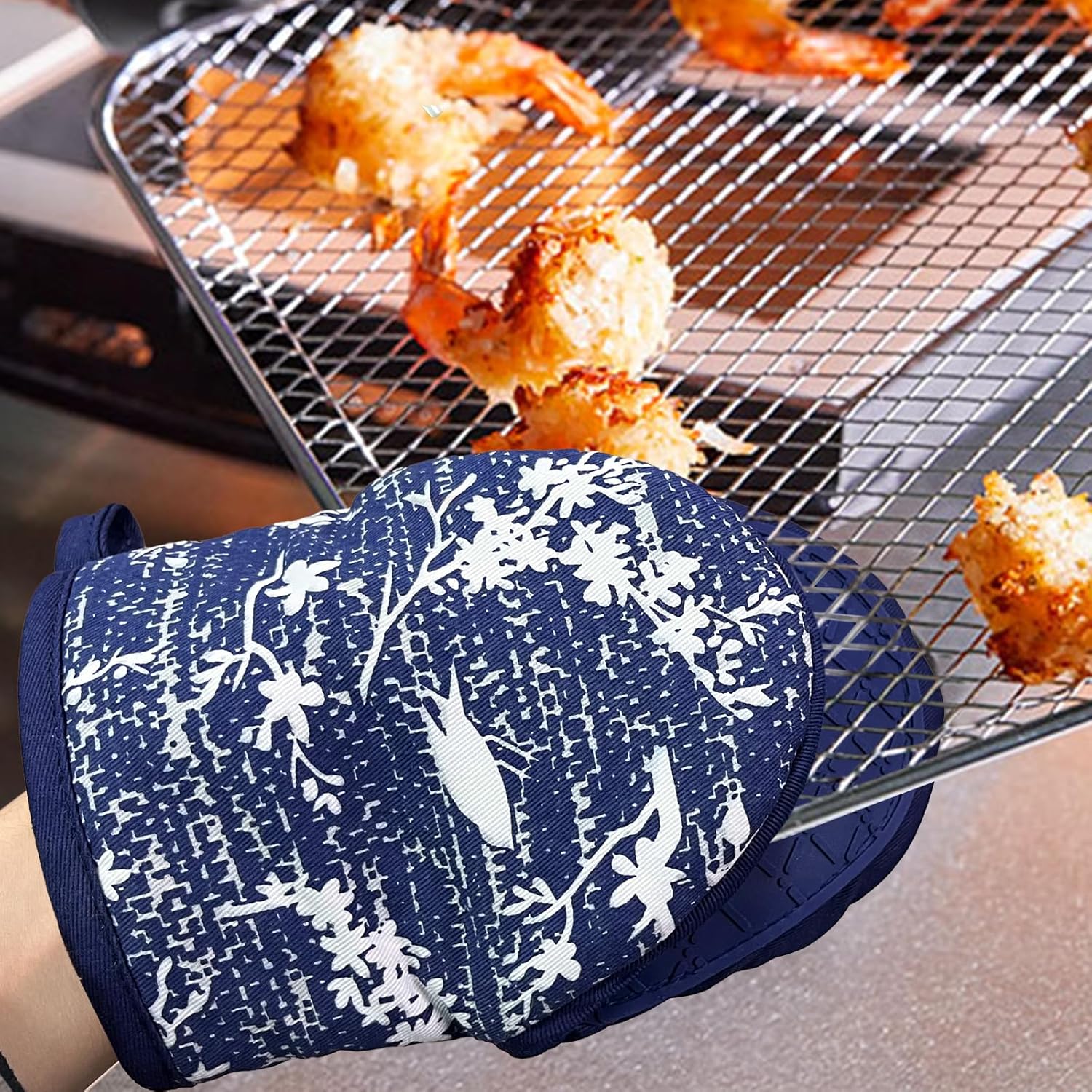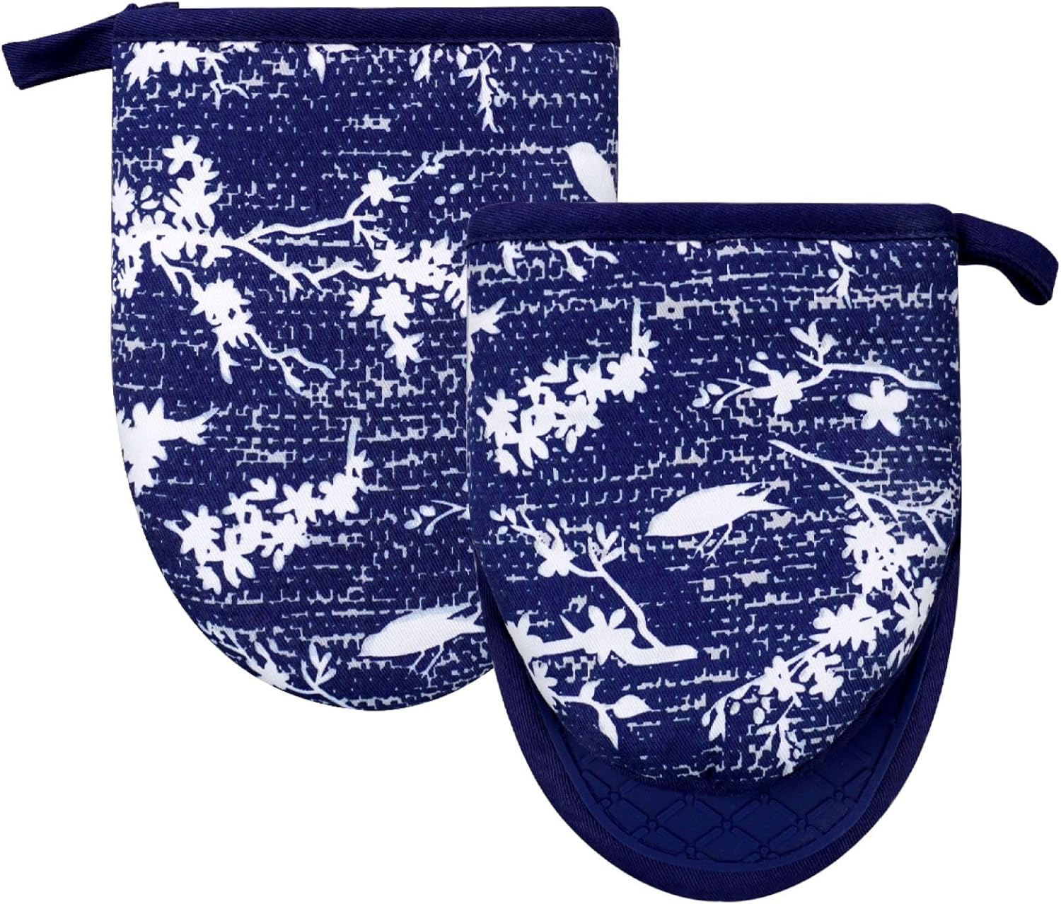 Mini Silicone Oven Mitts, Heat and Slip Resistant Kitchen Gloves 2-Pack Set, Birds Flower Soft Short Oven Mittens, Flexible Thick Pot Holders for Safe Cooking Baking and Grilling (Navy)