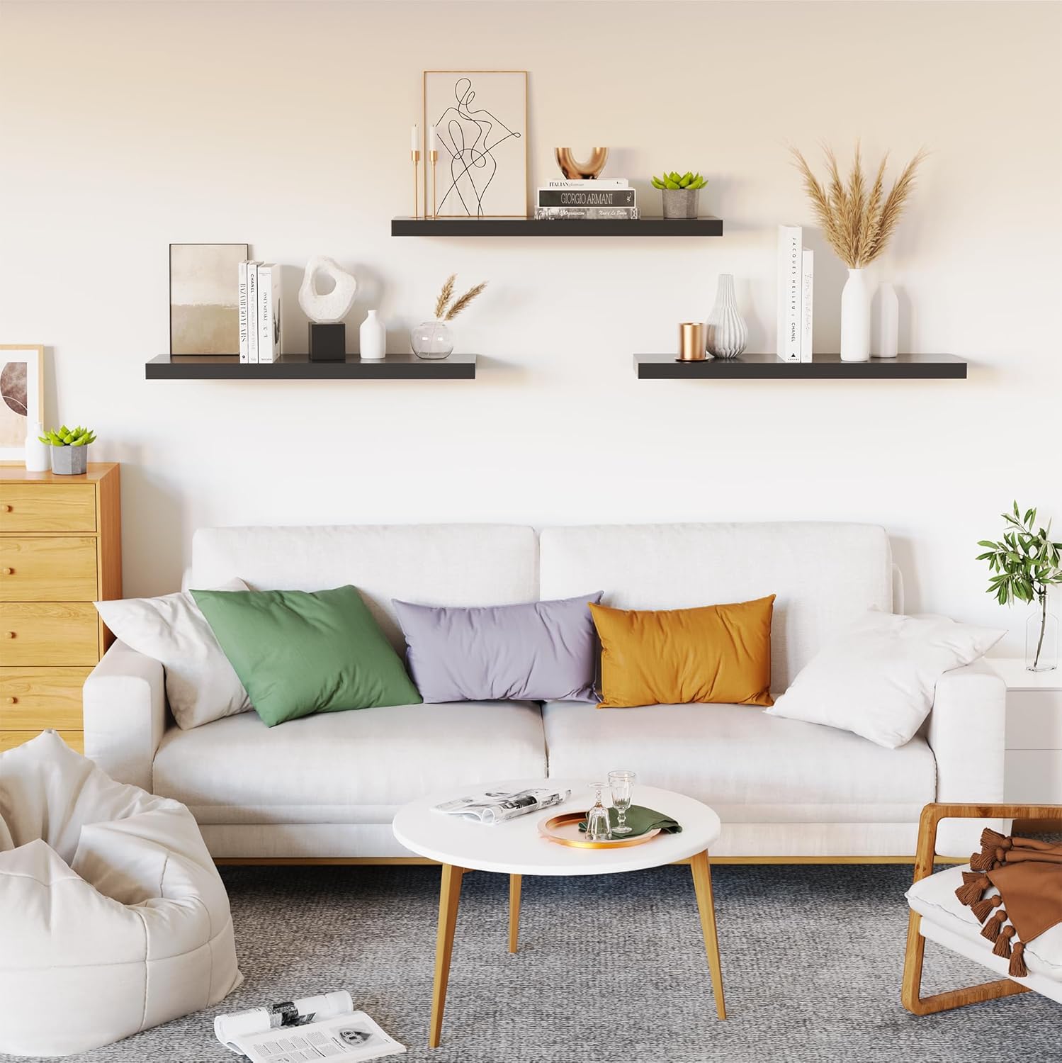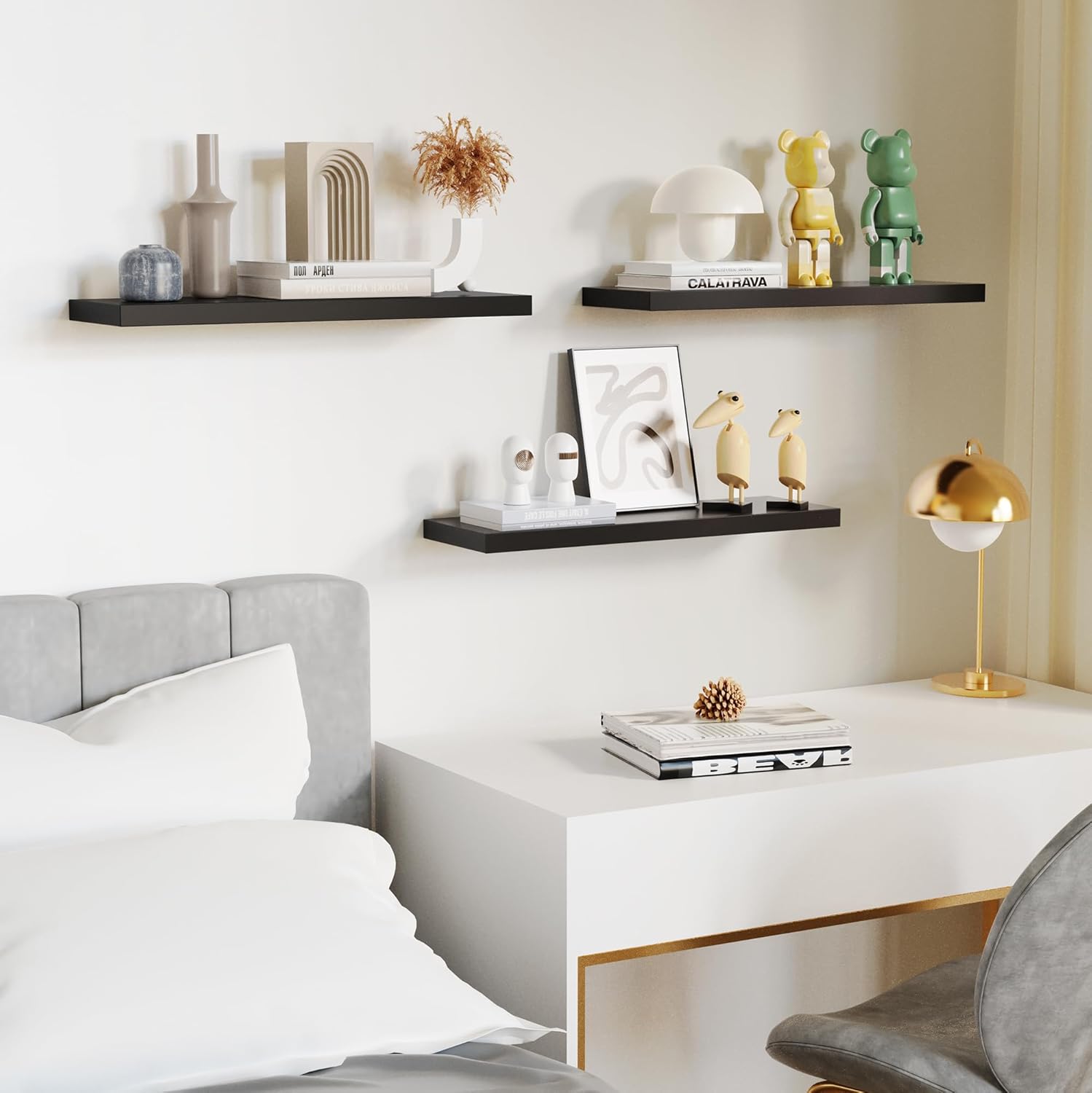 Floating Shelves - Black Wood Wall Shelf Set of 3, 24" Wall Mounted, Kitchen, Living Room, Bedroom, Bathroom Storage, Book Shelf, Frame Display