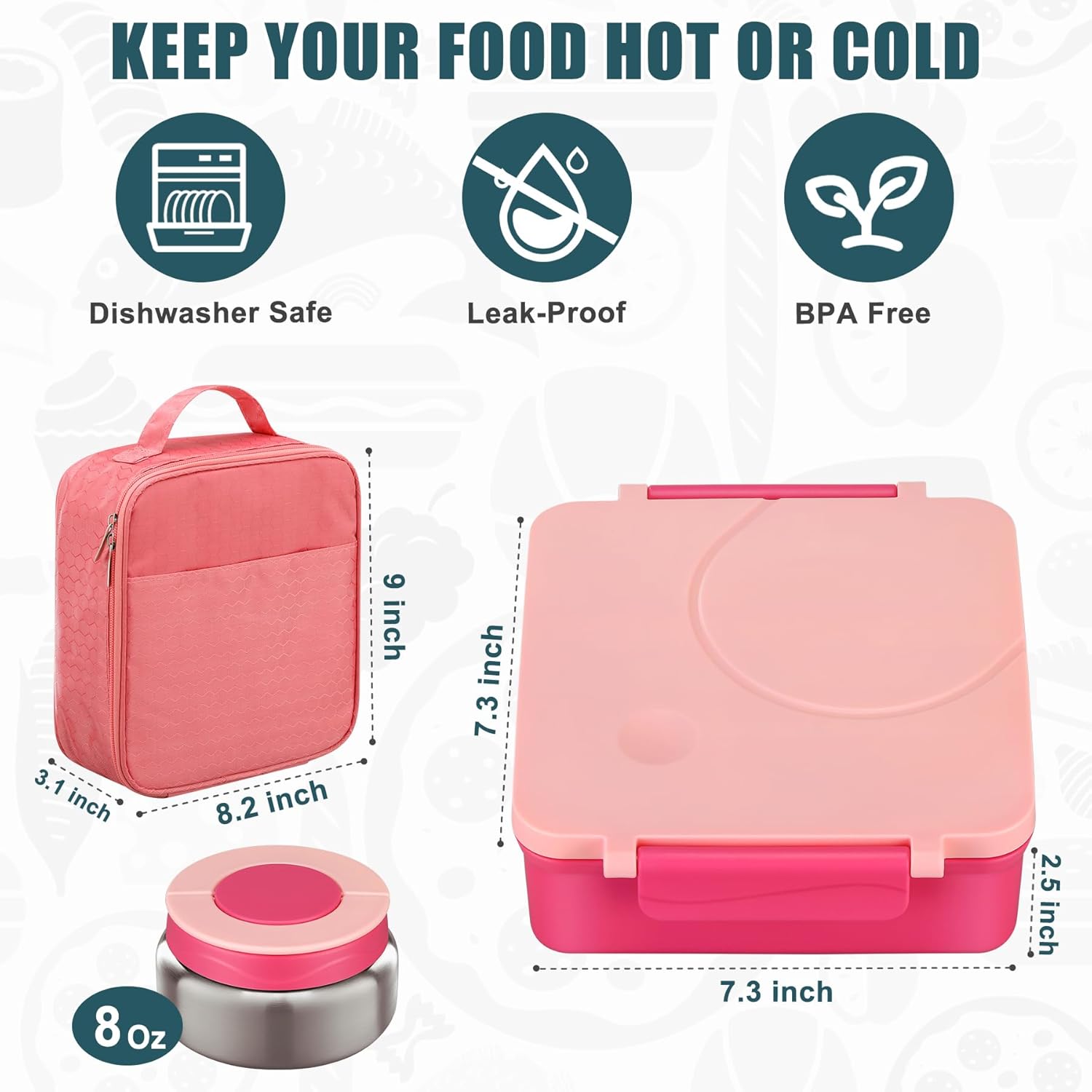 Bento Lunch Box for Kids with 8oz Soup Thermo&Lunch Bag, Leak-Proof Lunch Food Containers with 4 Compartment, Hot Food Insulated Food Jar for Kids School (Pink)