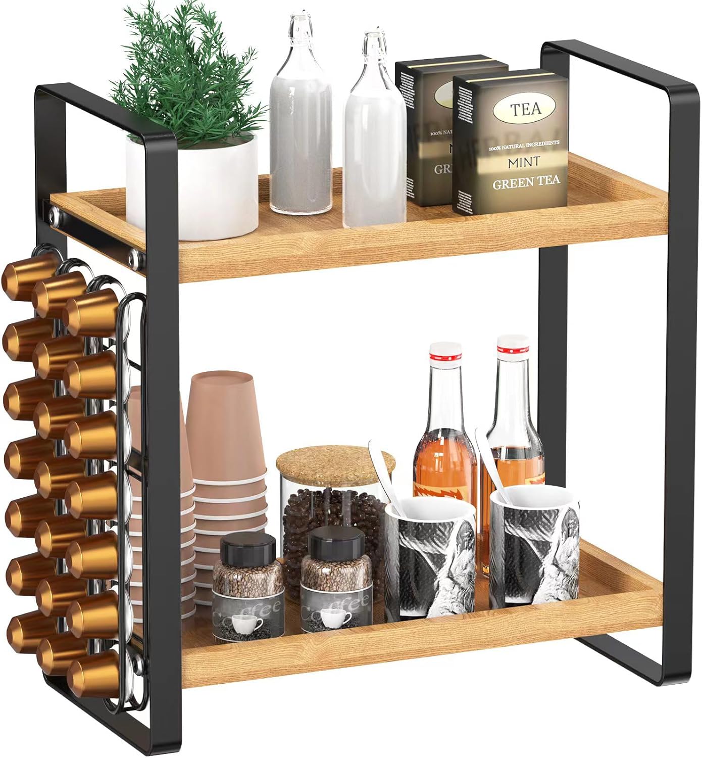 - JUST RIGHT COFFEE STATION ORGANIZER: The simple design provide a multifunctional coffee station organizer perfect for creating a clean and organized coffee space. This coffee bar organizer has 3 spacious compartments, the 2 Tier wood shelves used to store coffee pods, sugar, tea bags, instant coffee and more,and the side Metal Coffee Rack is compatible with coffee Cups and stylishly showcases up to 24 of your favorite coffee pod.The entire shelf greatly expands the usage space and makes it easier for you to pick up coffee bar acessoires home organization must haves 2024