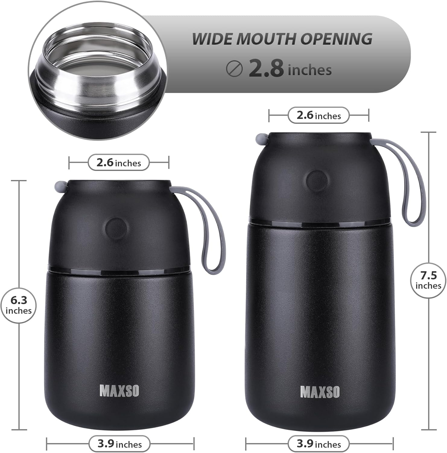 - 【Set of 2 Food Containers with Upgrade Seal Lids】Package comes with 2 insulated lunch Insulatedes (17oz + 24oz), also with 1 foldable spoon and 1 foldable fork that fit inside. With advanced vacuum insulation technology, you can totally trust our food container during your lunch time. Dimension:17oz - 3.9 inch wide, 6.9 inch high; 24oz - 3.9 inch wide, 7.5 inch high;