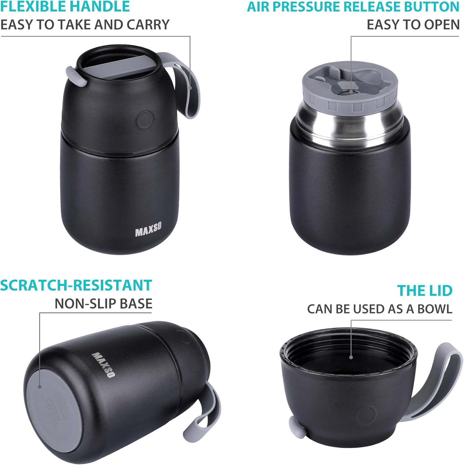 - 【Attractive & Practical Vacuum Food Container】It takes top marks for its superior insulation, 304 stainless steel material, BPA free, no PVC, 17oz capacitie and a versatile design that works for toddlers, kids and adults. This Insulated food container with foldable spoon on the lids for occasionally forgetting to bring tableware and not being able to eat delectable.