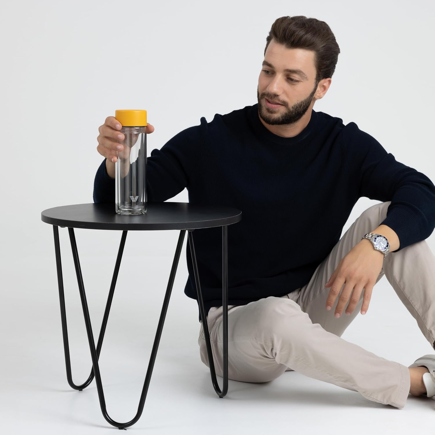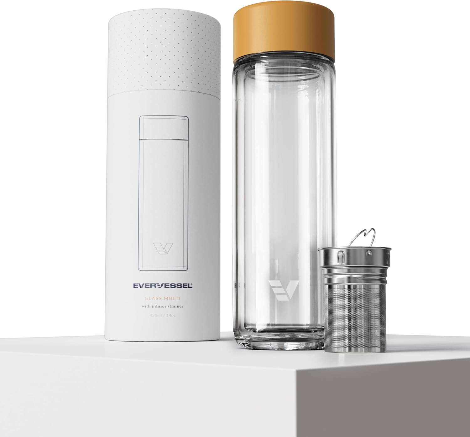 Glass Multi Tea Infuser Bottle 14oz - Double Wall Borosilicate Glass Flask | No Plastic Touches Contents | Perfect for Office or Home - Yellow