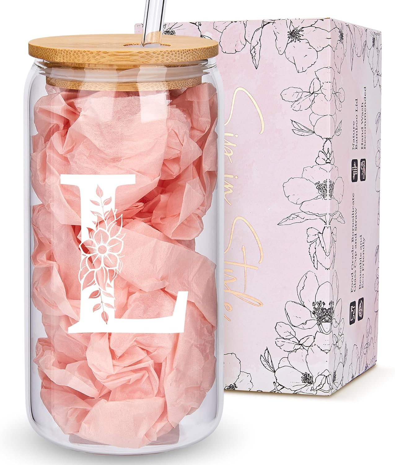 Personalized Gifts for Women, Monogrammed Glass Cups with Lids and Straws, Custom Tumbler, Cute Customized Mug, Aesthetic Stuff, Initial Iced Coffee Cup, Drinking Glasses, Birthday Teacher Gifts, L