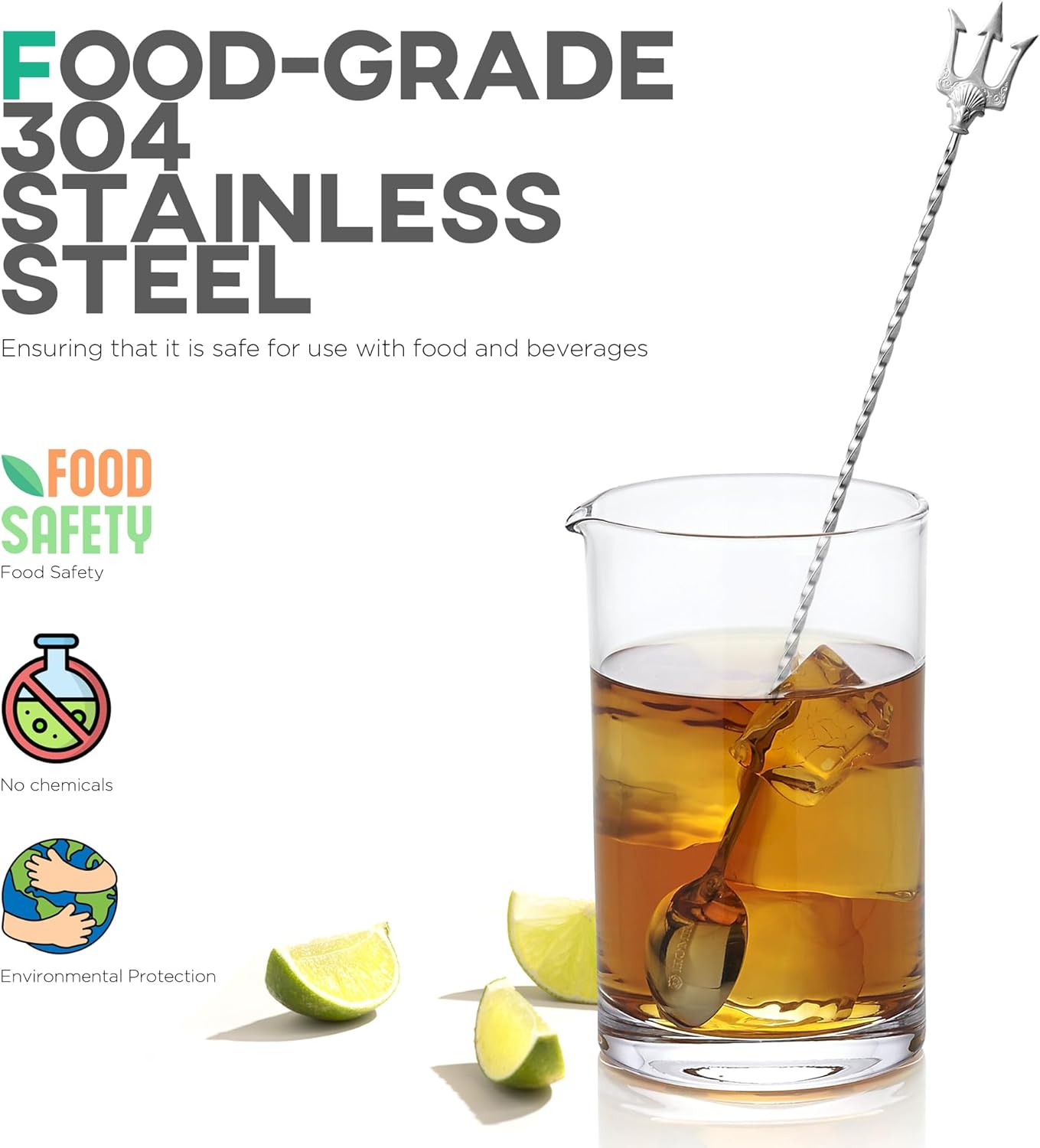 - OPERATION: The zinc alloy trident decoration on the top of the spoon adds a unique and charming style to your bar tools, and a spiral shaped rod in the middle for better control and grip, designed to spin effortlessly. Perfect for stirring drinks, mixing cocktails, juices, smoothies or milkshakes.