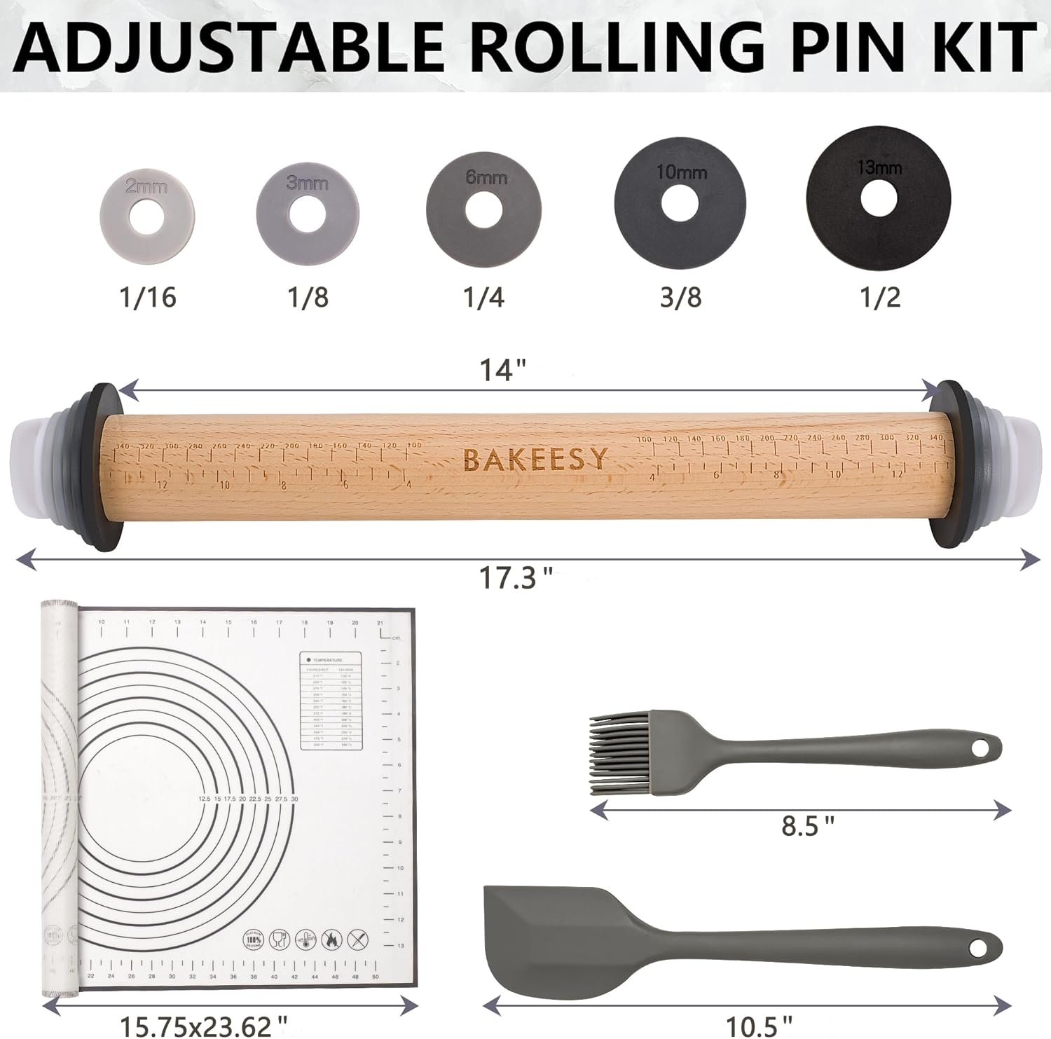 Bakeesy's 14' Wooden Rolling Pin Set with 5 Adjustable Thickness Rings - Roller Pin for Rolling Pizza, Cookie Dough, Pastry, Ravioli, Clay Slab - Full Set with Accessories - Perfect Baking experience