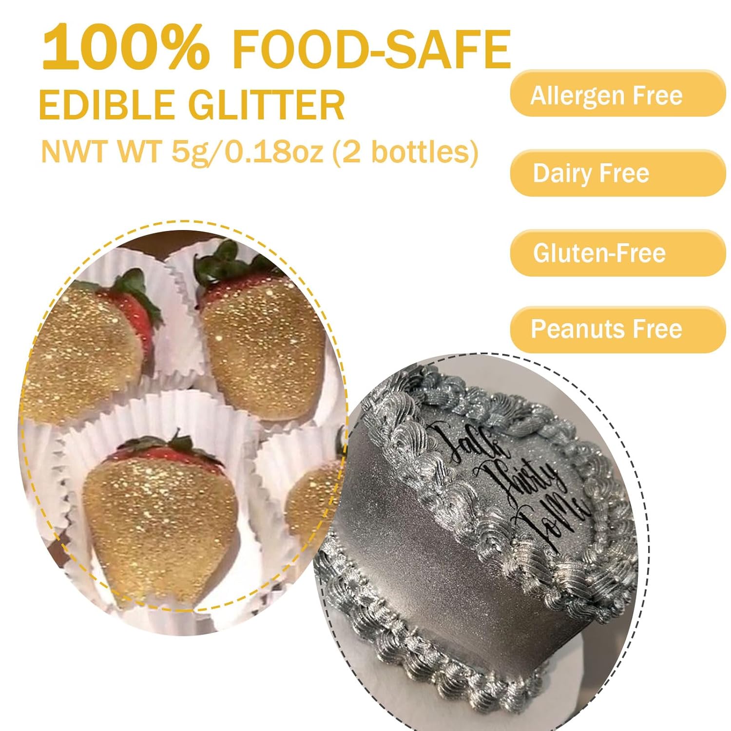 - Widely Used Edible Glossy Glitter for Desserts - Gold Shimmer disco edible glitter dust is great to use for strawberries, chocolates decoration, cookies, fondant, elevates cakes, cupcakes, cake topper, and other gourmet baked goods, metal finish, fudge/chewing gum, pull candy/isomaltose, etc., It is also suitable for parties drinks decorating, like champagne, beverages, cocktails, and more