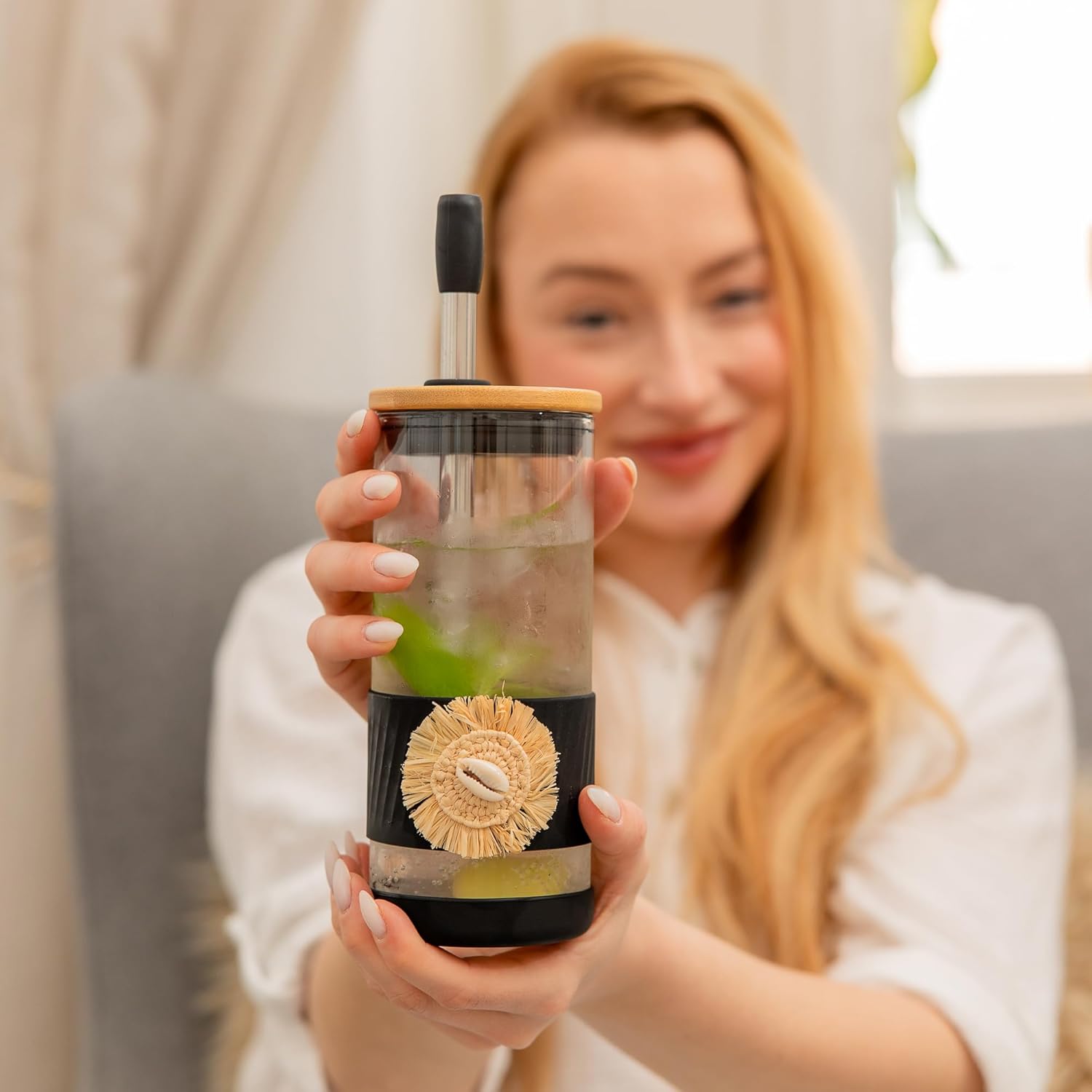 Pandaloo® Glass Cups With Lids and Straws -20 Fl Oz- Hand Made cool shell-raffia detail- Perfect Size Iced Coffee Cup - Smoothie Cup - BPA Free- (Ethnic-Chic Natural, 1 Count (Pack of 1))