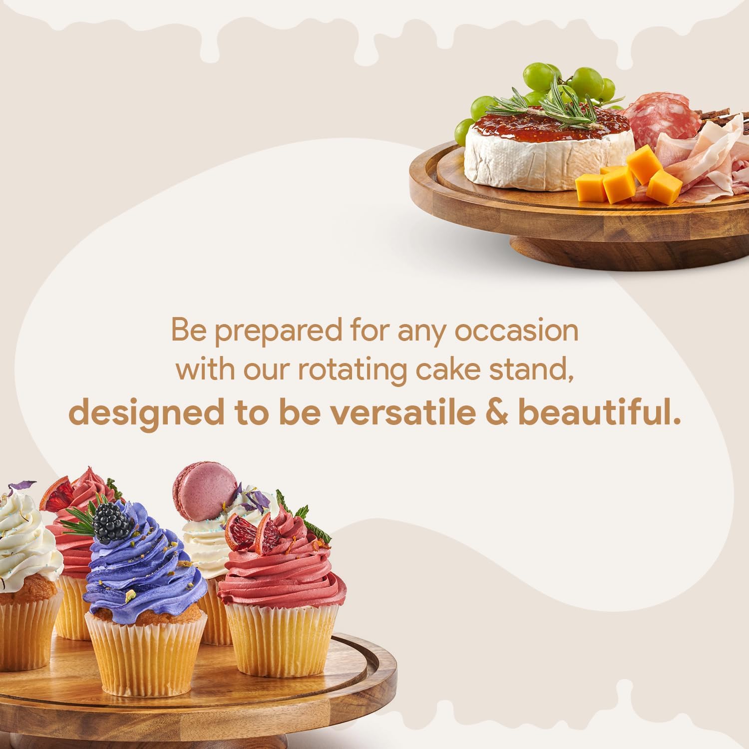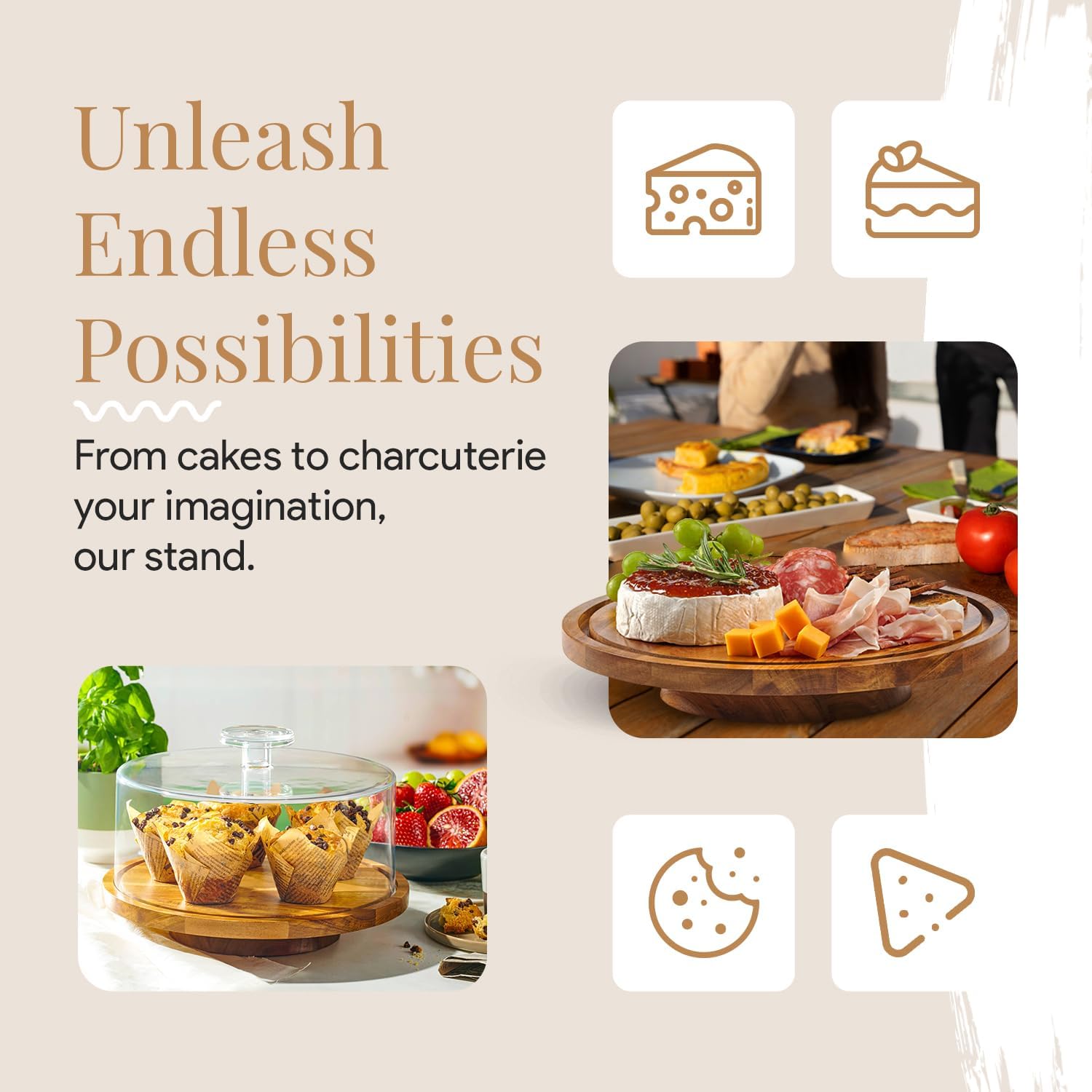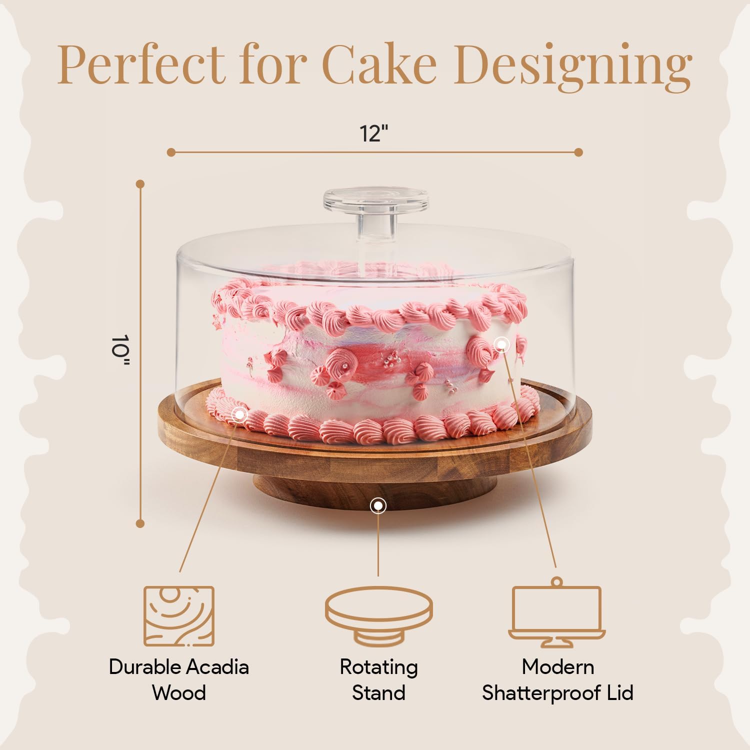 - Shatterproof Cake Platter - This wooden cake stand is crafted from the finest acacia wood & resilient acrylic plastic, this spinning cake stand is a powerhouse of durability! Unlike a fragile glass cake dome, the acrylic cake dome is lightweight, easy to clean & built to last
