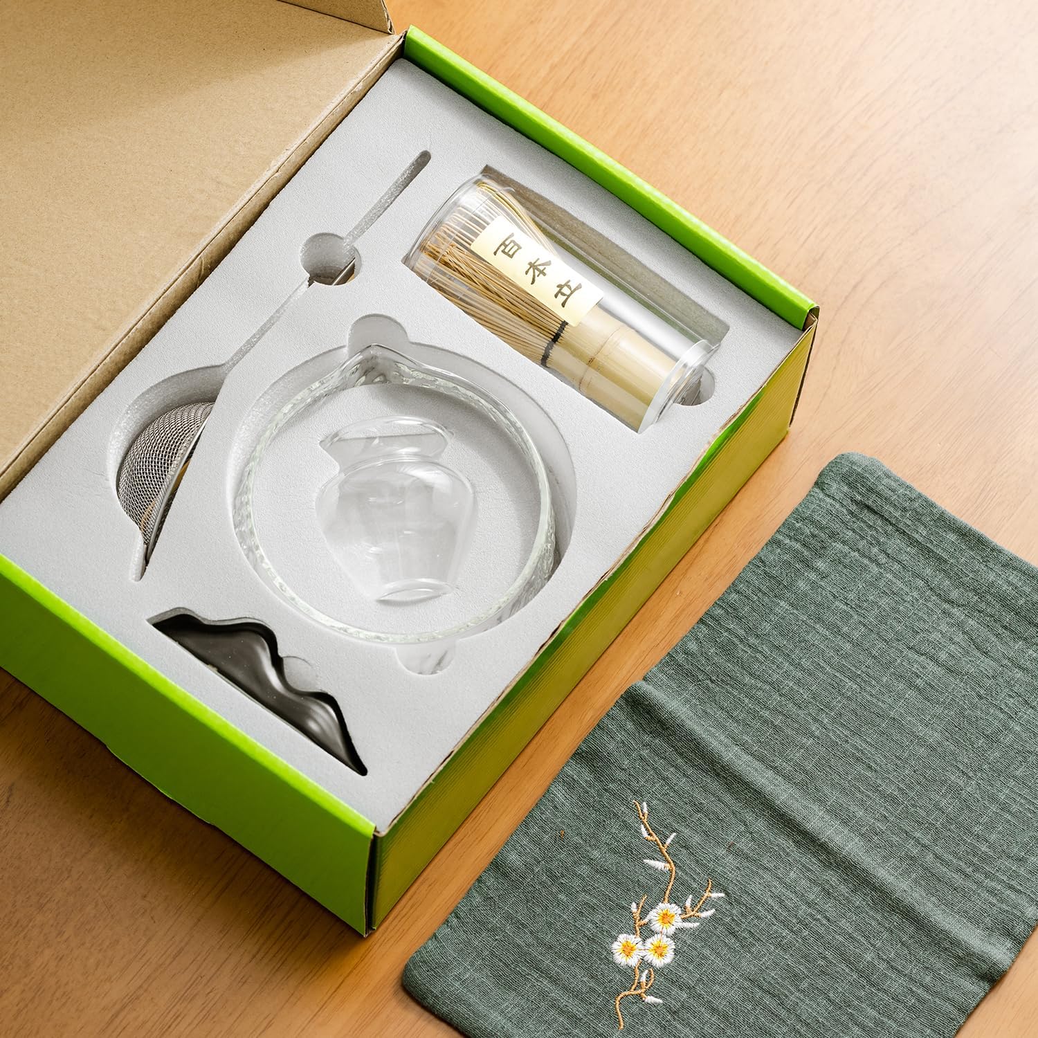 - PREMIUM MACHATA CEREMONY SET. It is 7 pcs / set, Contain:: 1* Bamboo Whisk, 1* Bamboo Scoop (Chashaku), 1*glass bowl (Chawan) 510 ml/18 oz, 1* Whisk Holder. 1* Ceramic Scoop Stand, 1* Cotton Tea Cloth (Chakin), 1* Matcha Powder Sifter. This kit makes it very easy to adopt matcha as a lifestyle