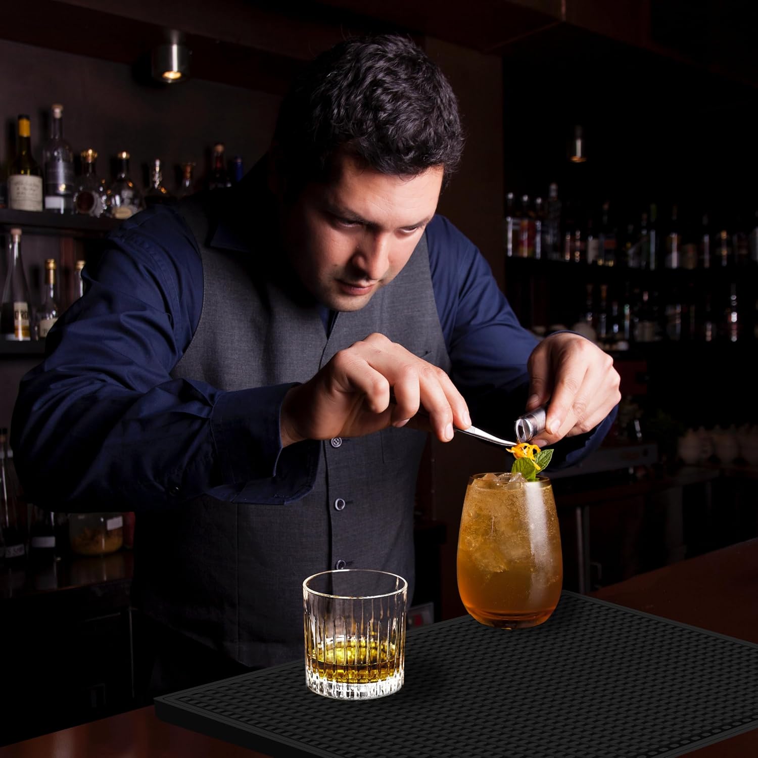 - HIGH QUALITY MATERIAL: Our black bar mat is made from the best materials, which have been carefully chosen to make sure it is very strong and will last a long time. Whether it's in a busy bar or a cosy home coffee corner, this mat is built to last.