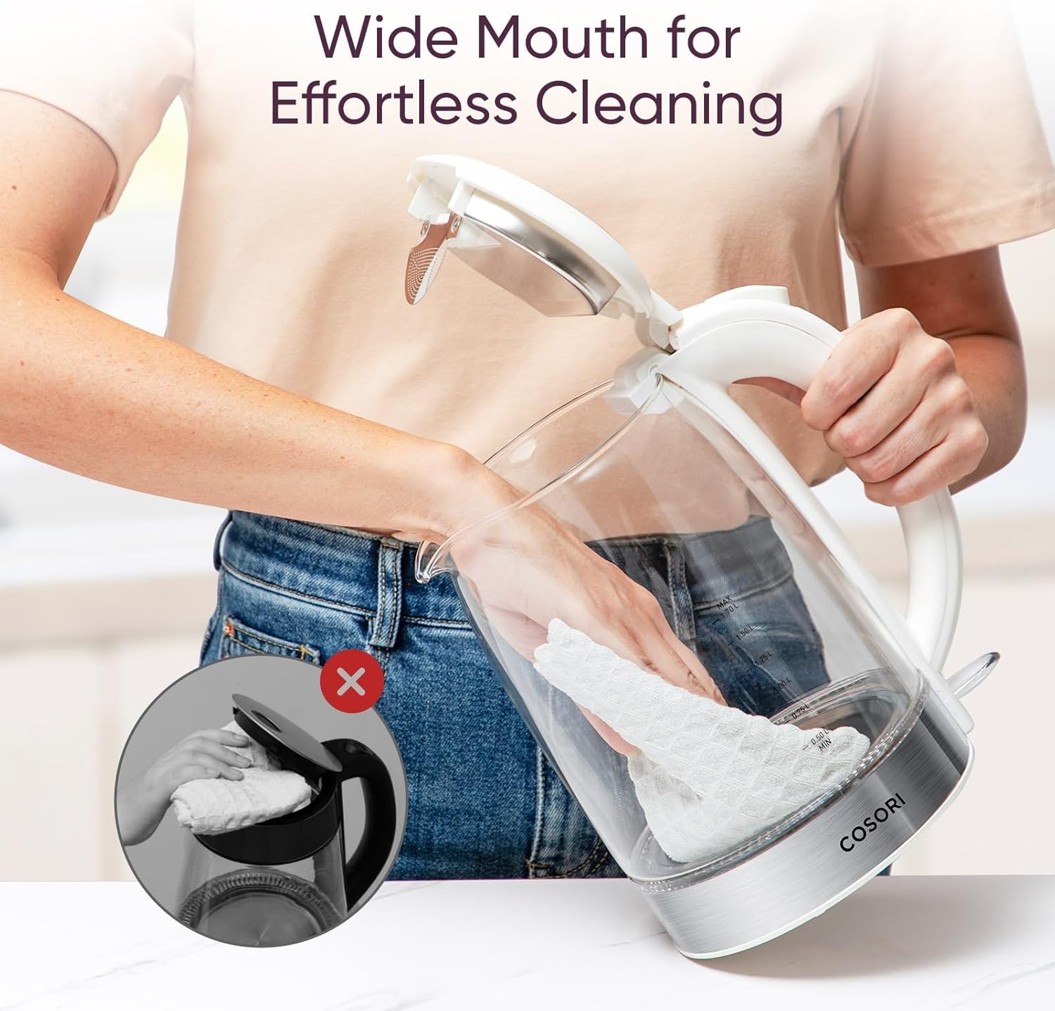 Cosori Electric Kettle, No Plastic Filter & Spout, Tea Kettle & Hot Water Boiler For Coffee & Tea, Water Heater & Teapot, Automatic Shut Off, Borosilicate glass, White, 1.7L/1500W