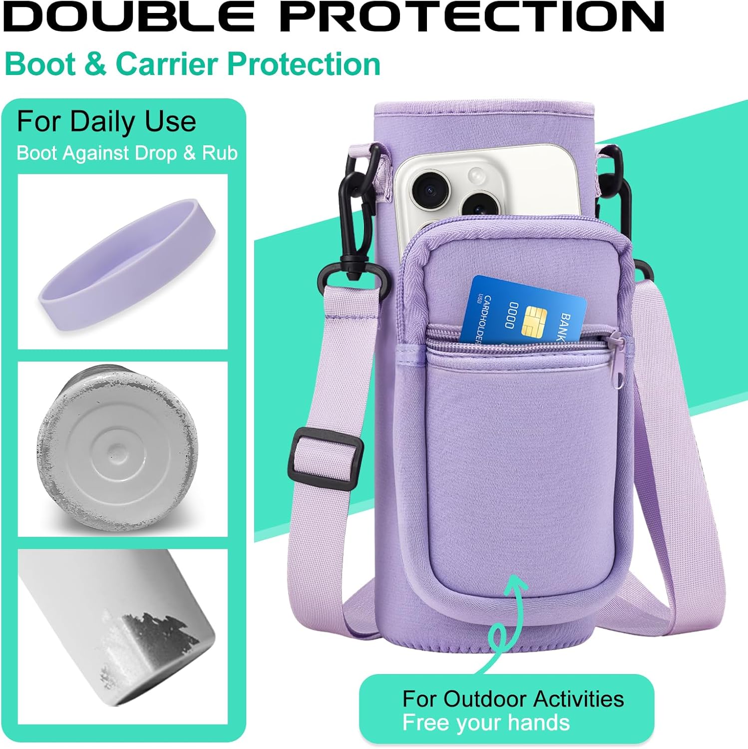 - BOTTLE CARRIER BAG—Multifunctional: The carrying pouch with storage made with neoprene material provide extra protect & insulate for your travel sports water bottle. It has 2 zippered pockets to hold your cards, keys and phones of any size, which is helpful if you have a lot to carry on one trip