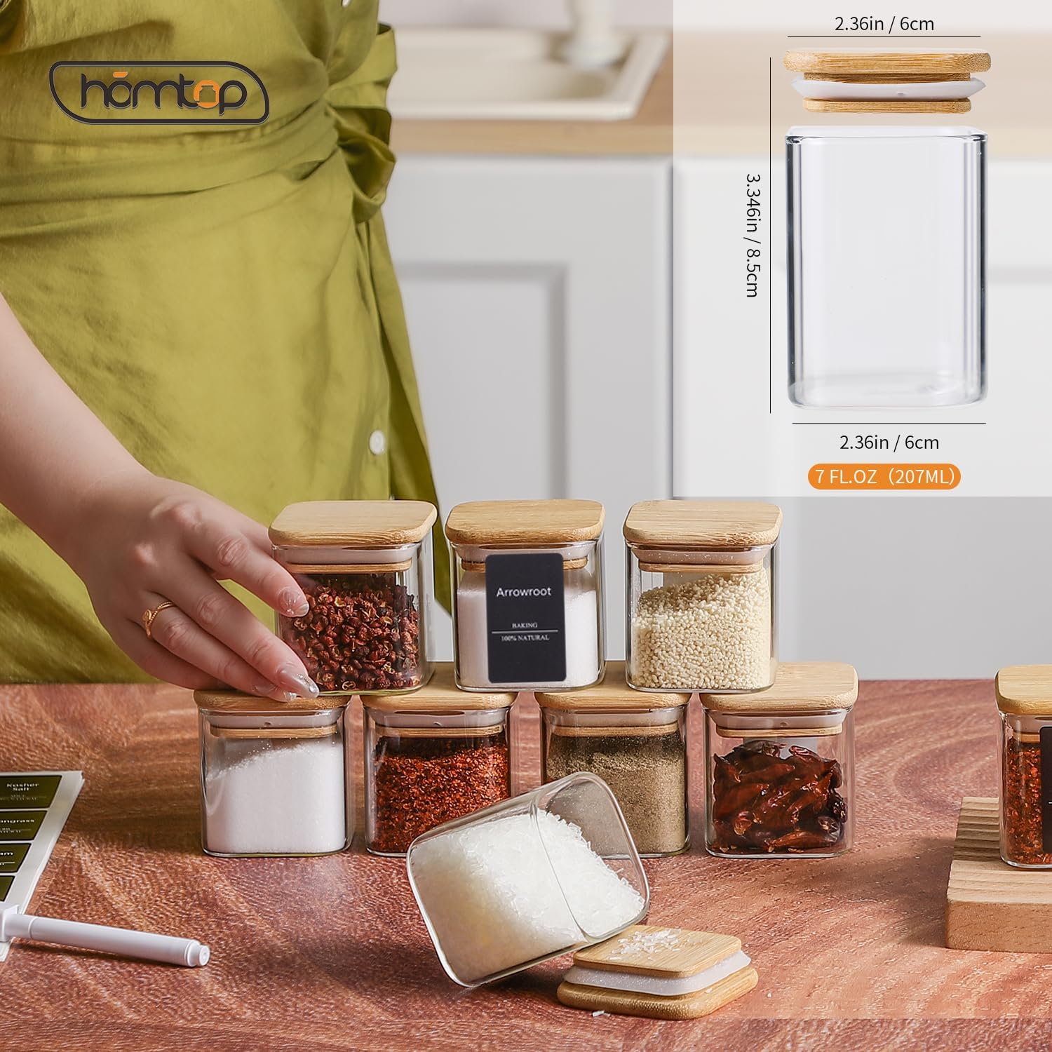 10Pcs 7oz Spice Jars Glass Container with 275 Labels, Airtight Seasoning Empty Organizer with Bamboo Lid Set for Pepper, Salt, Sugar