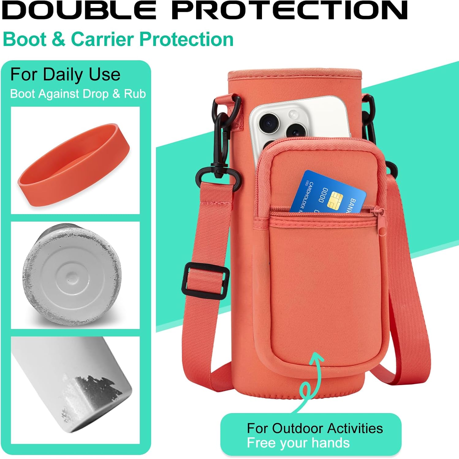 - BOTTLE CARRIER BAG—Multifunctional: The carrying pouch with storage made with neoprene material provide extra protect & insulate for your travel sports water bottle. It has 2 zippered pockets to hold your cards, keys and phones of any size, which is helpful if you have a lot to carry on one trip
