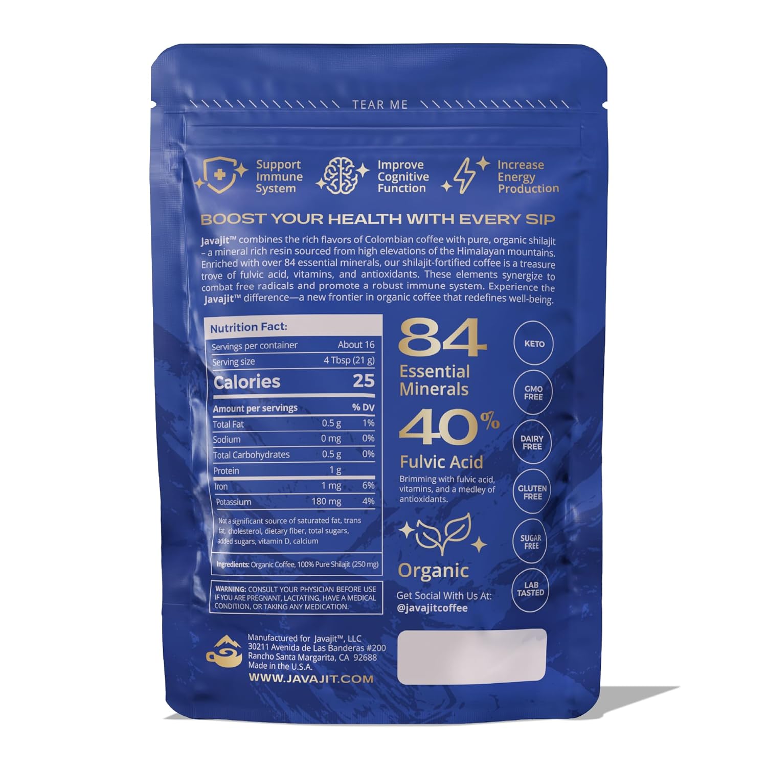 Colombian Coffee with Shilajit – Medium Roast Organic Ground Coffee, Energy & Immunity Boost, 250mg Himalayan Shilajit per Serving, 16 Servings