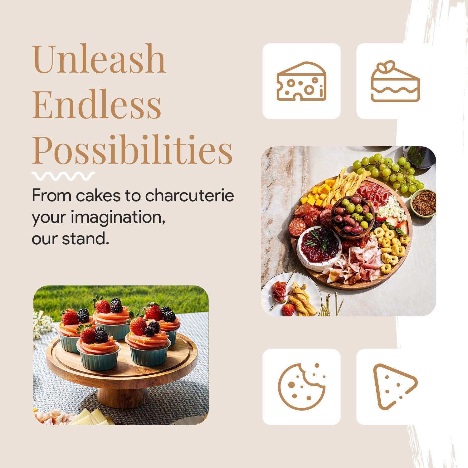 - Party Platter Perfection - Unleash your inner entertainer with a multifunctional serving platter. When flipped over, this wooden cake stand doubles as a charcuterie board, and can even be used for chips, dips, popcorn, or as a fruit bowl with flair