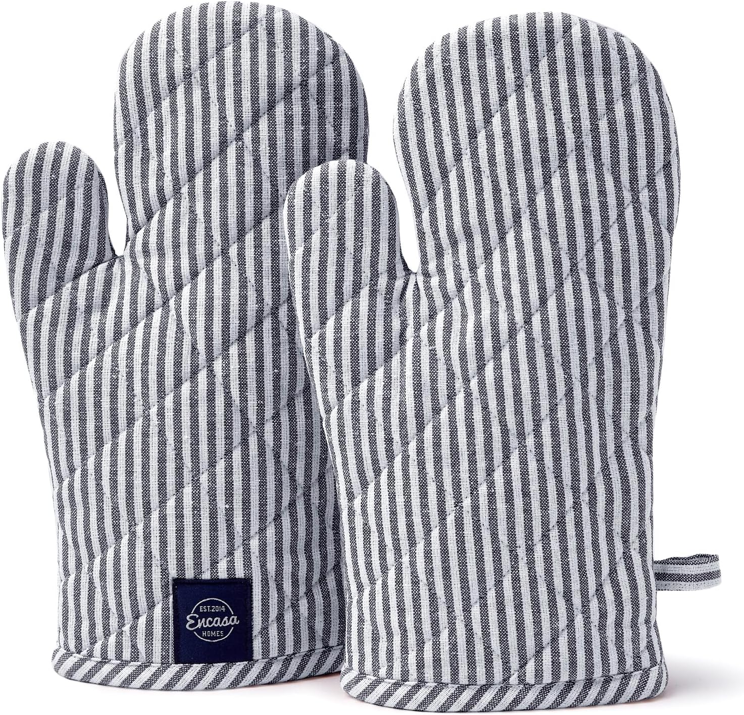 Encasa Homes Long 12"x7" Oven Microwave Hand Gloves Mitts (2 pc Set) for Kitchen Cooking & Baking - Heat Resistant, Thick & Safe, Protection of Hands from Hot Utensils - Ticking Navy Blue