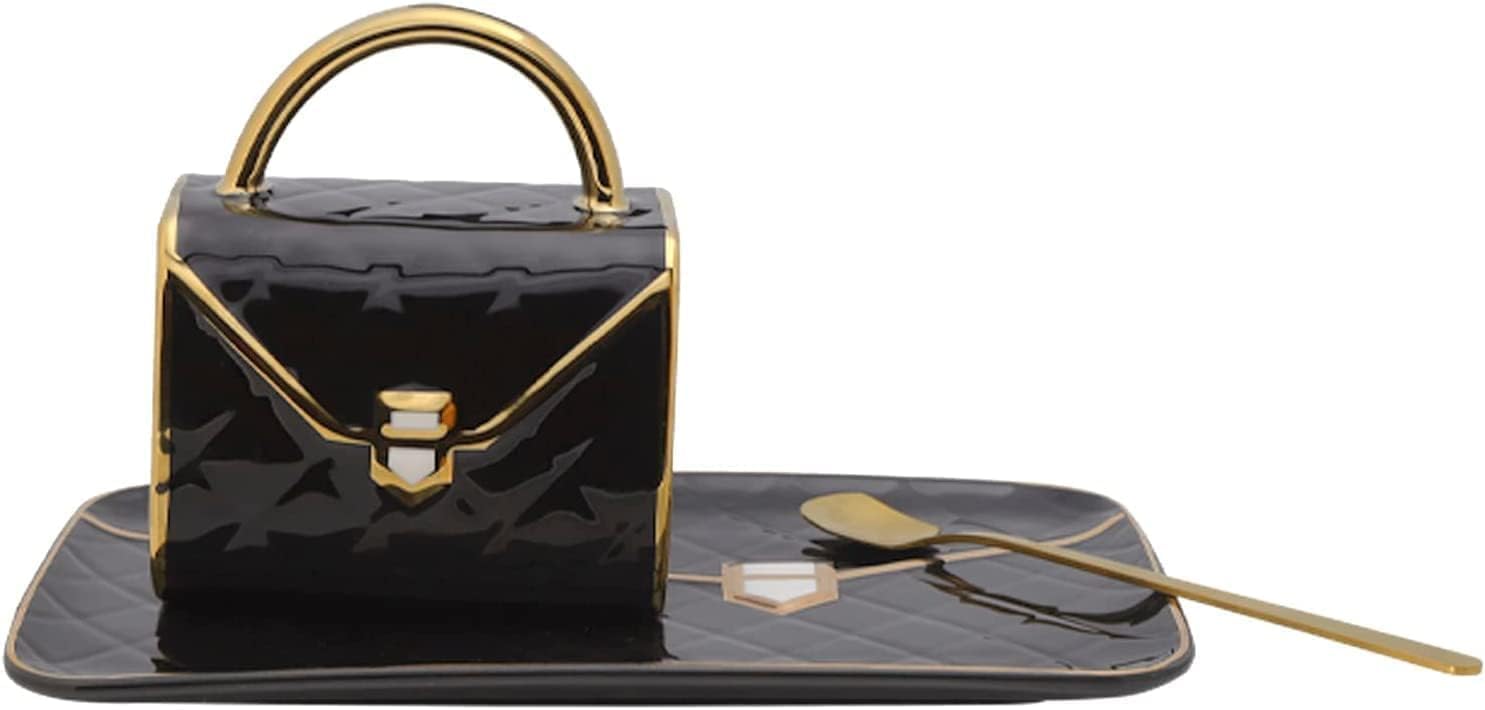 YnsfreeCeramic Purse Coffee Mugs Set Tea Cup Unique Bag shaped mug and Saucer Set with Spoon and Saucer For Women Thanksgiving Christmas Gifts (Black)