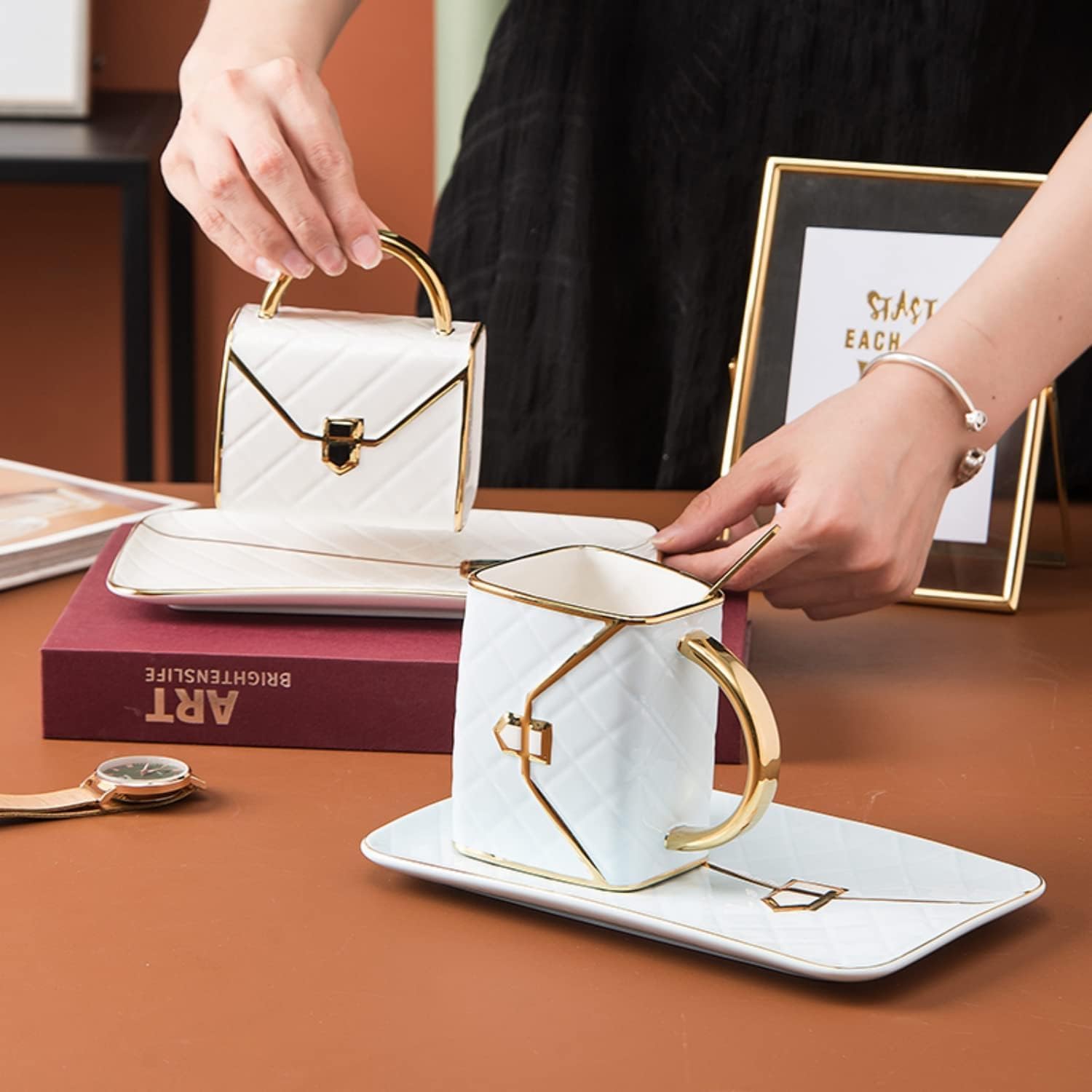 - Coffee Mugs For Women ---- Unique women's handbag diner mug with tray and spoon,310 ml ceramic coffee mug,great birthday or christmas gifts for women